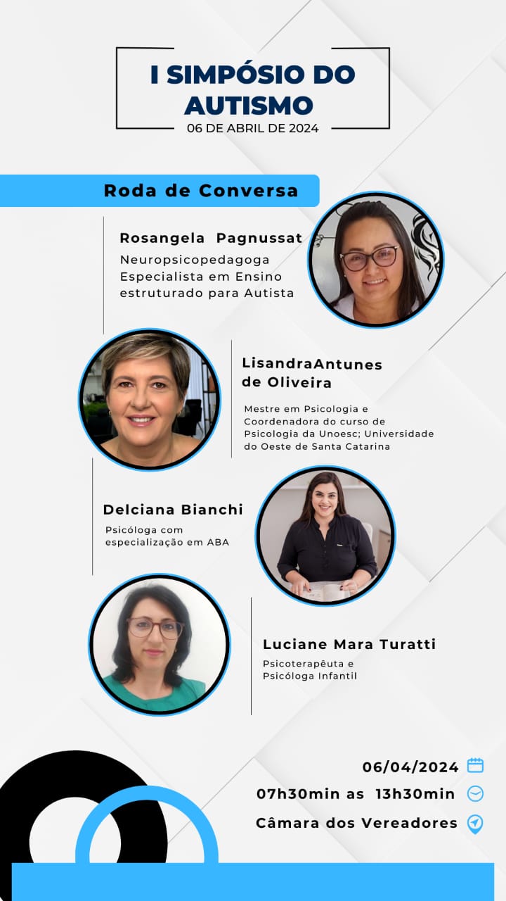 Na sequência, será desenvolvida uma Roda de Conversa, com a participação de Rosangela Pagnussat (neuropsicopedagoga, especialista em ensino estruturado para autistas), Lisandra Antunes de Oliveira (mestre em Psicologia e coordenadora do curso de Psicologia da Unoesc), Delciana Bianchi (psicóloga com especialização em ABA), e Luciane Mara Turatti (psicoterapeuta e psicóloga infantil).