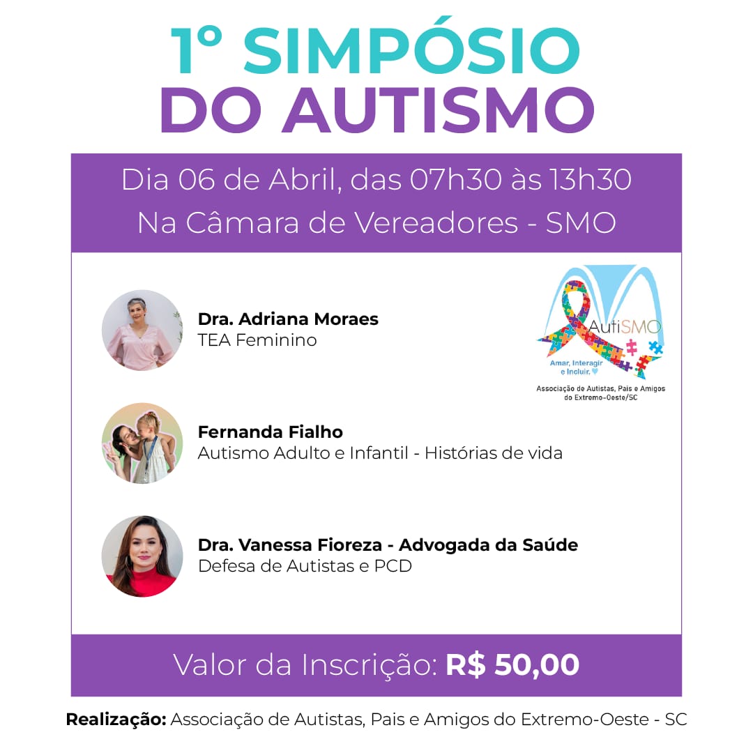 Última atualização: 2024/04/03 4:46:26Acontece neste sábado (06), das 7h30 às 13h30, no plenário da Câmara de Vereadores de São Miguel do Oeste, o 1º Simpósio do Autismo, promovido pela Associação de Autistas, Pais e Amigos do Extremo Oeste de Santa Catarina.