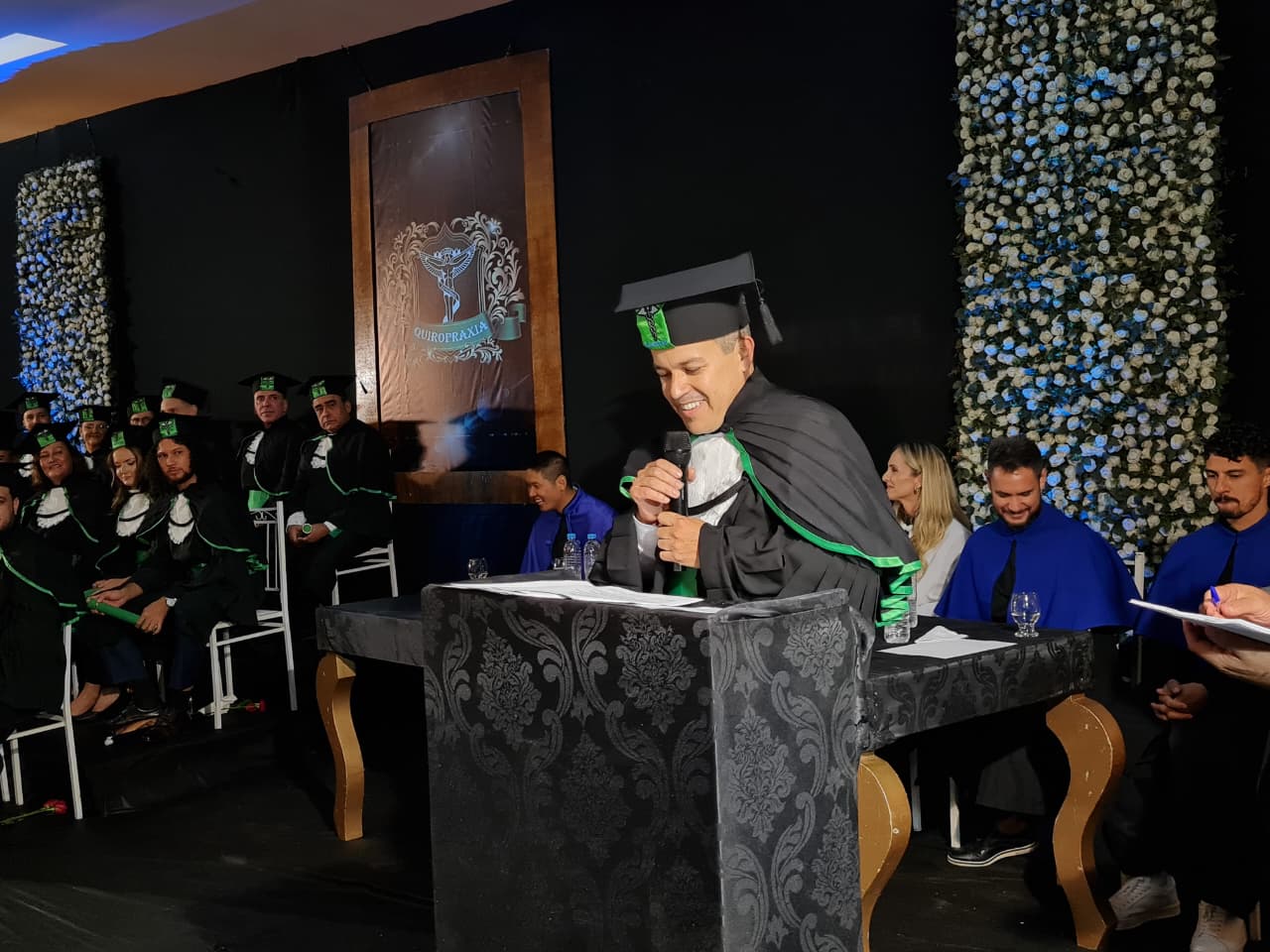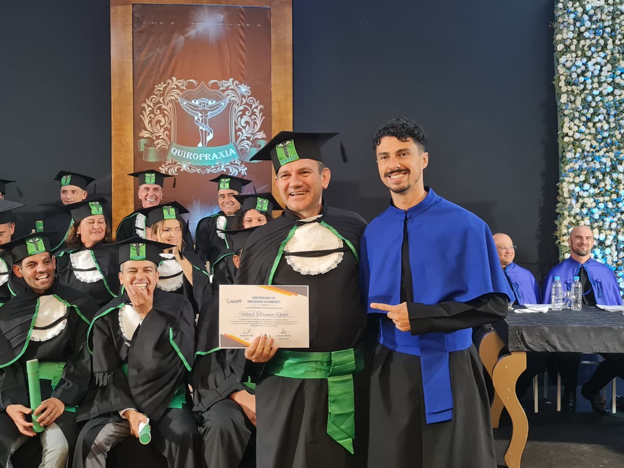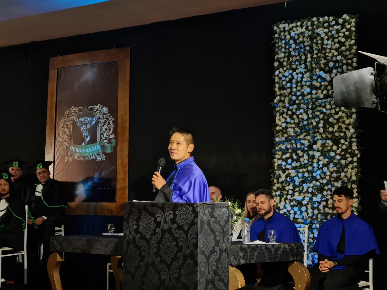 Para compor a mesa diretora dos trabalhos, estiveram presentes a coordenadora pedagógica da UCEFF, Elaine Cristina de Souza Neves Serpa, neste ato representando o reitor da instituição, Leandro Sorgatto, o coordenador do curso de Quiropraxia, professor Filipi Zanrosso, o coordenador adjunto do curso de Quiropraxia e patrono da turma, professor Wolney Hass Junior, o paraninfo da turma, professor Felipe Ferreira, o professor homenageado, Thomas Hiroyuki Miyazawa Oku, e o diretor e representante da Associação Brasileira de Quiropraxia, Pablo Pasqualotti.