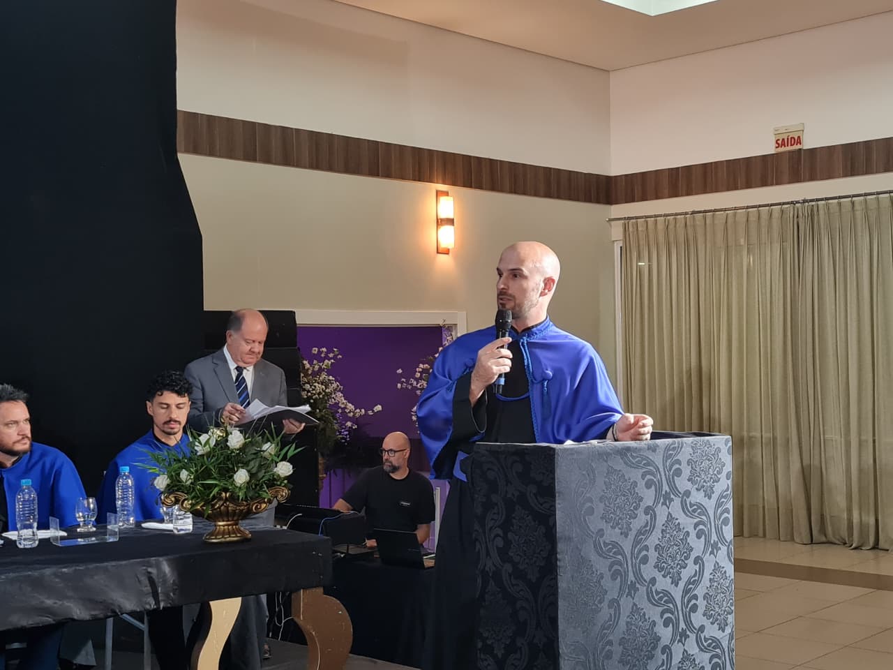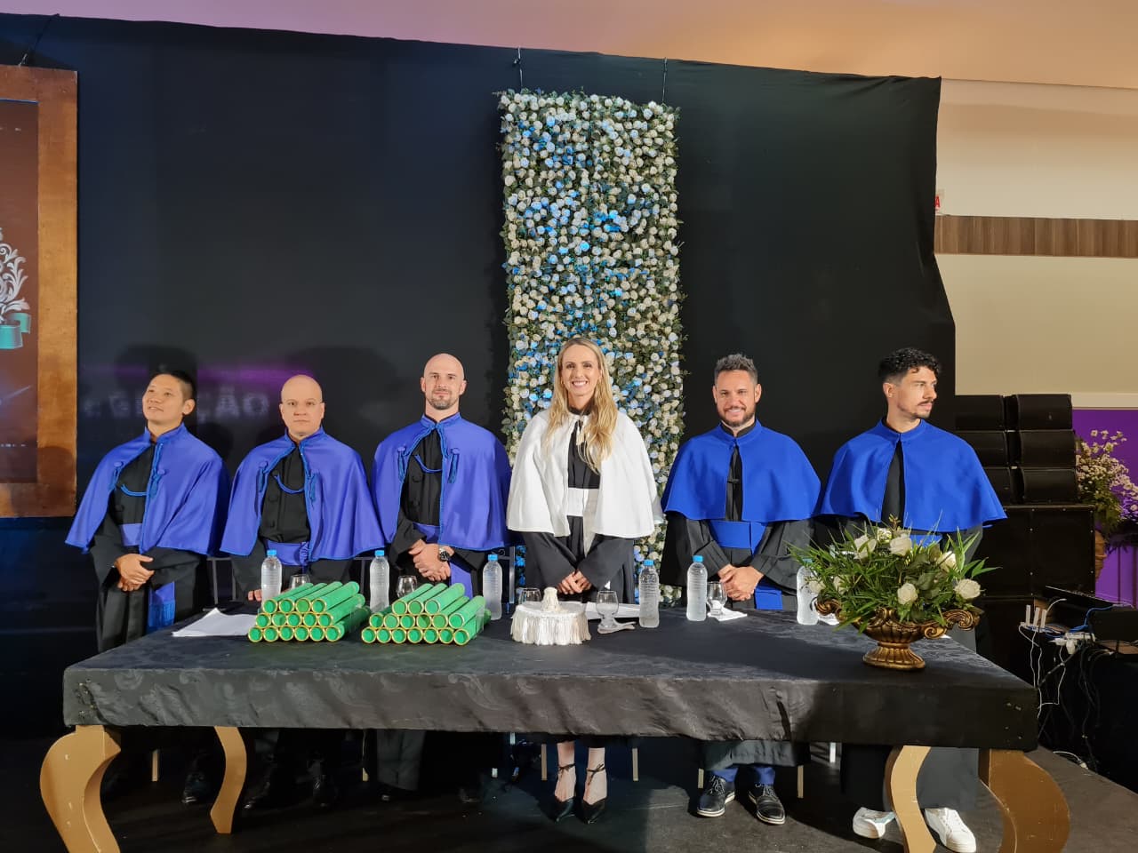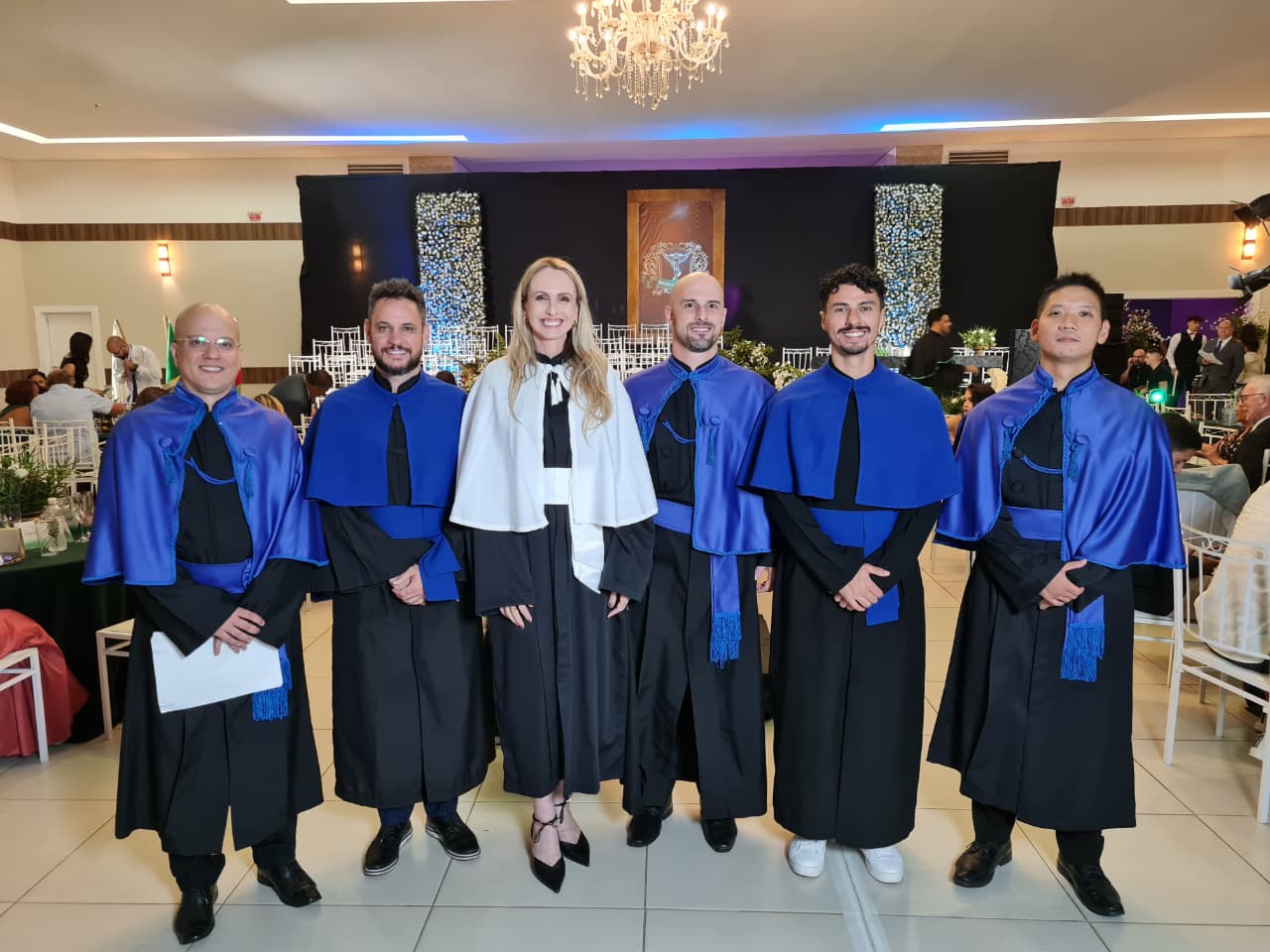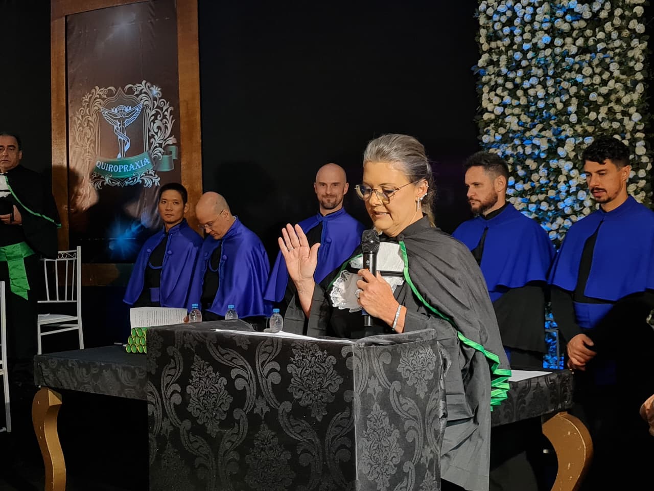 Para compor a mesa diretora dos trabalhos, estiveram presentes a coordenadora pedagógica da UCEFF, Elaine Cristina de Souza Neves Serpa, neste ato representando o reitor da instituição, Leandro Sorgatto, o coordenador do curso de Quiropraxia, professor Filipi Zanrosso, o coordenador adjunto do curso de Quiropraxia e patrono da turma, professor Wolney Hass Junior, o paraninfo da turma, professor Felipe Ferreira, o professor homenageado, Thomas Hiroyuki Miyazawa Oku, e o diretor e representante da Associação Brasileira de Quiropraxia, Pablo Pasqualotti.