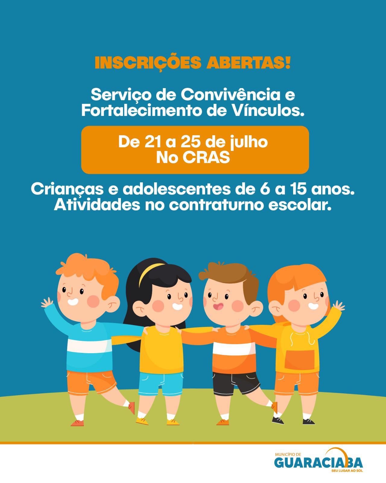 Última atualização: 2025/07/21 9:01:38A Secretaria de Assistência Social de Guaraciaba informa que as inscrições para o Serviço de Convivência e Fortalecimento de Vínculos estão abertas e podem ser feitas a partir desta segunda-feira, 21, até quinta-feira, 24. Para realizar a inscrição, é necessário apresentar documentos pessoais da criança e do responsável.