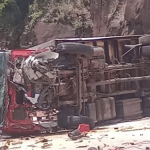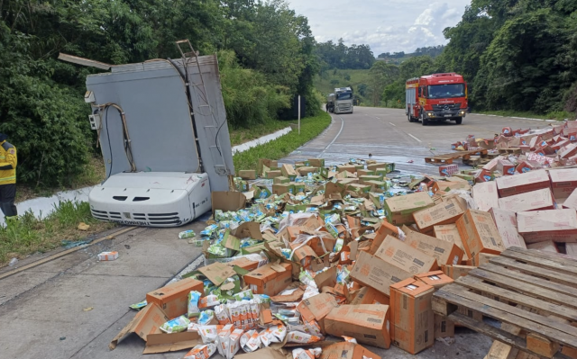 Última atualização: 2025/11/05 5:17:10A BR-163, em São José do Cedro, teve o trânsito completamente interditado no início da tarde desta quarta-feira (5), após um acidente envolvendo dois veículos de carga e um automóvel. A colisão lateral ocorreu por volta das 12h30 e resultou no tombamento de um caminhão que transportava leite, derramando parte da carga sobre a pista e bloqueando o tráfego nos dois sentidos.