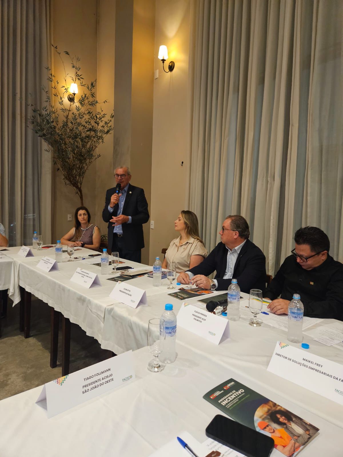 O encontro foi liderado pelo presidente da Federação das Associações Empresariais de Santa Catarina, Elson Otto e pela vice-presidente regional,Vanessa Brand Back Bertol, e teve como foco discutir incentivos ao desenvolvimento econômico regional.