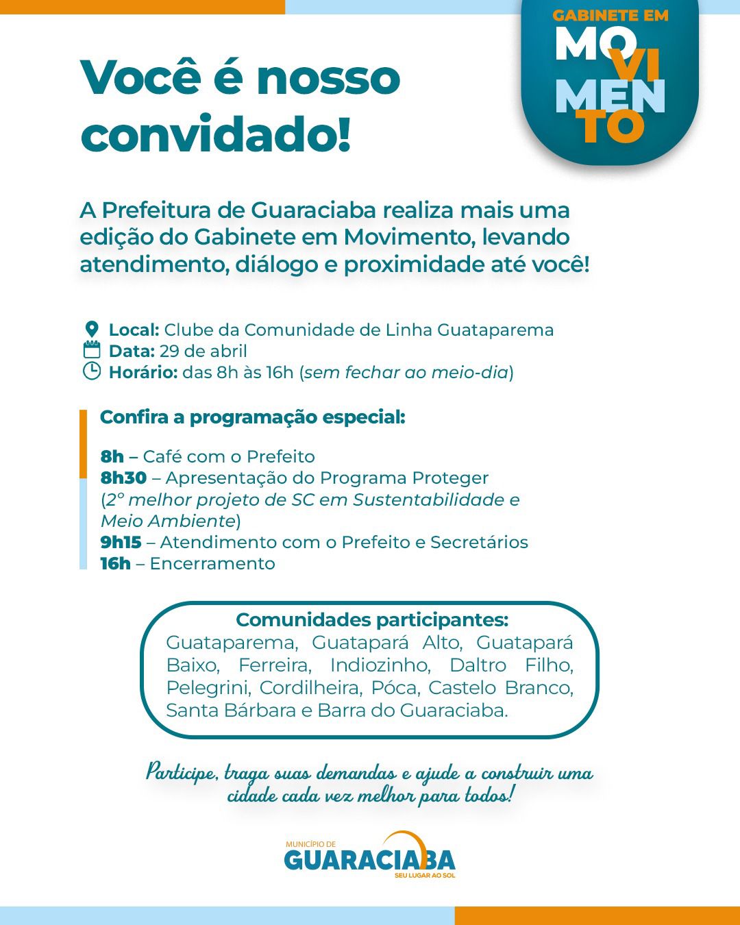 Última atualização: 2026/04/15 9:55:22A Administração Municipal de Guaraciaba comunica que realizará a segunda edição do Gabinete em Movimento, iniciativa que leva atendimento, diálogo e proximidade da gestão municipal até as comunidades do interior. A informação é do Prefeito Domingos Marcon. Ele explica que a programação acontecerá no Clube da Comunidade de Linha Guataparema, das 8h às 16h, sem fechar ao meio-dia.