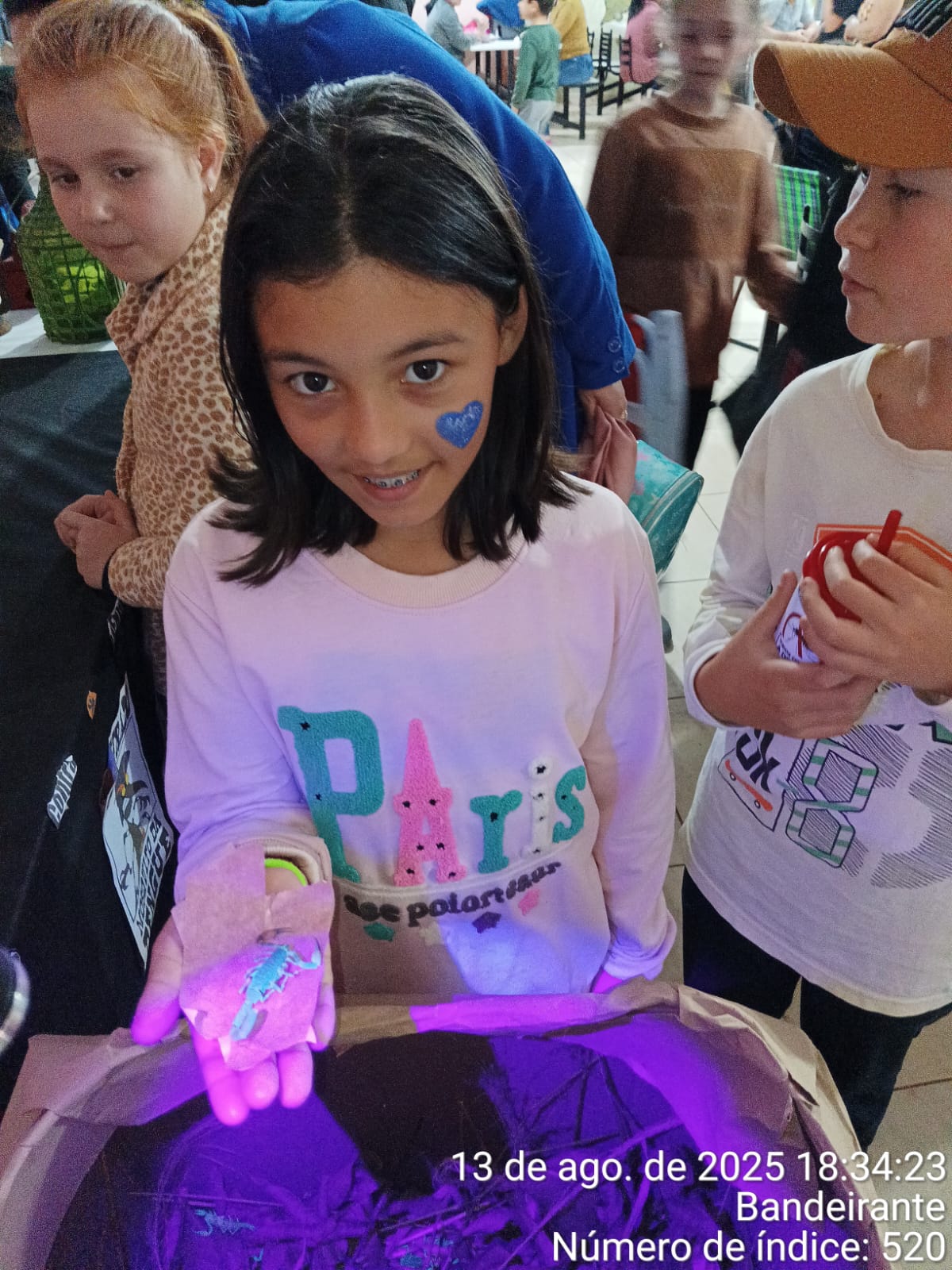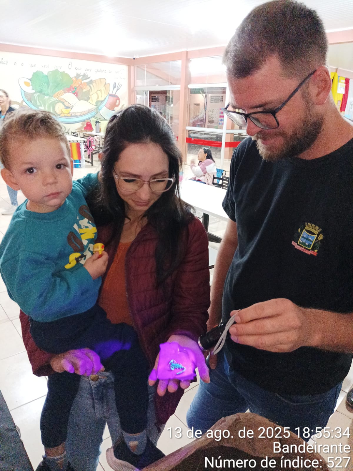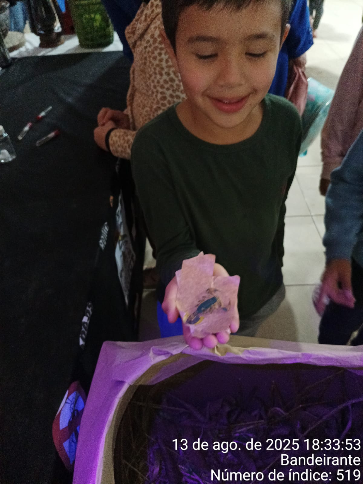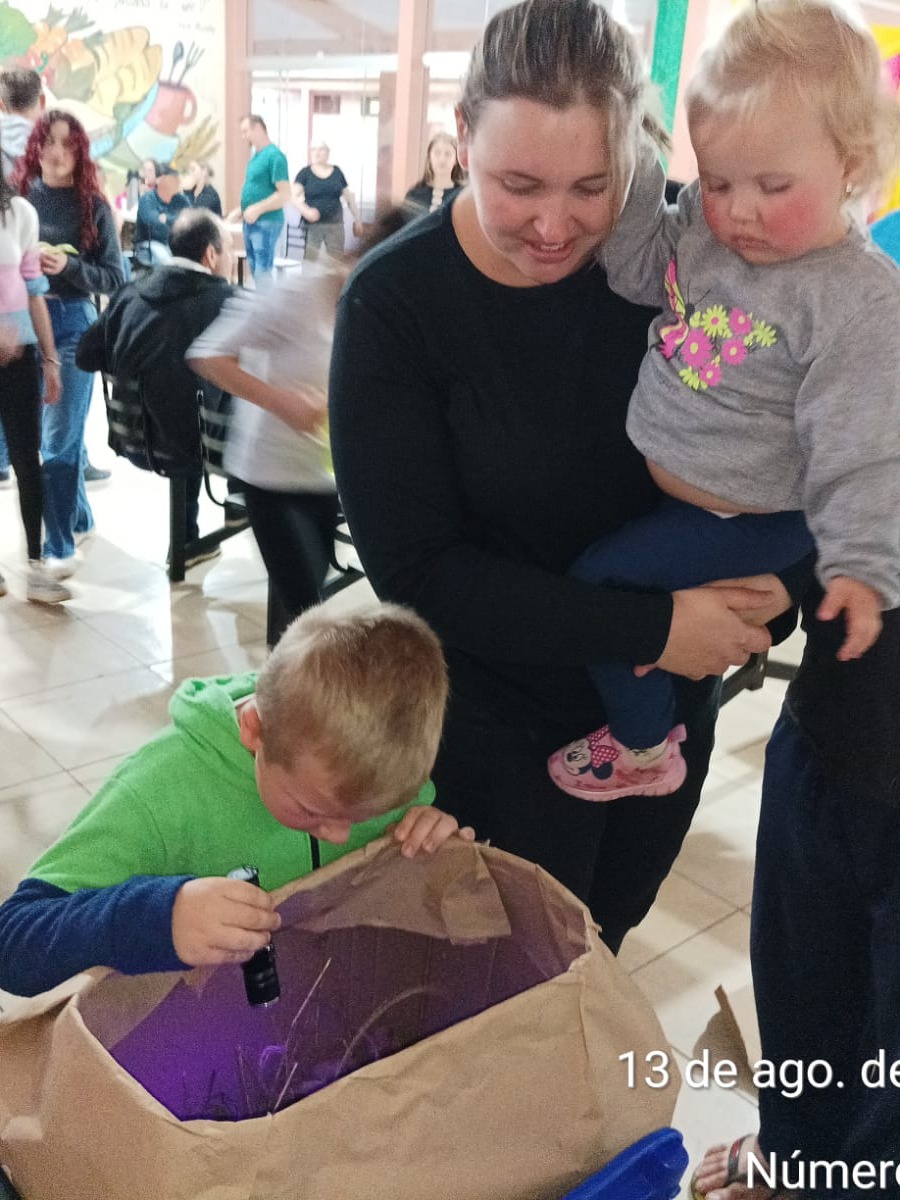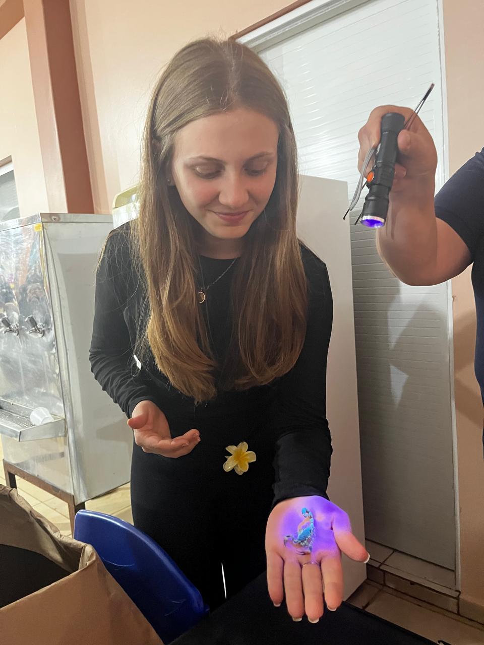 • Apresentação de aproximadamente 20 escorpiões, acondicionados em caixa apropriada. Para a visualização, os participantes utilizaram lanternas com luz ultravioleta (UV), recurso que evidenciou a substância hialina presente na carapaça do escorpião, responsável pelo brilho característico sob a luz UV.