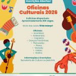 As oficinas ofertadas são: acordeon, artesanato, capoeira, danças folclóricas, percussão, piano, teclado, violão e violino.