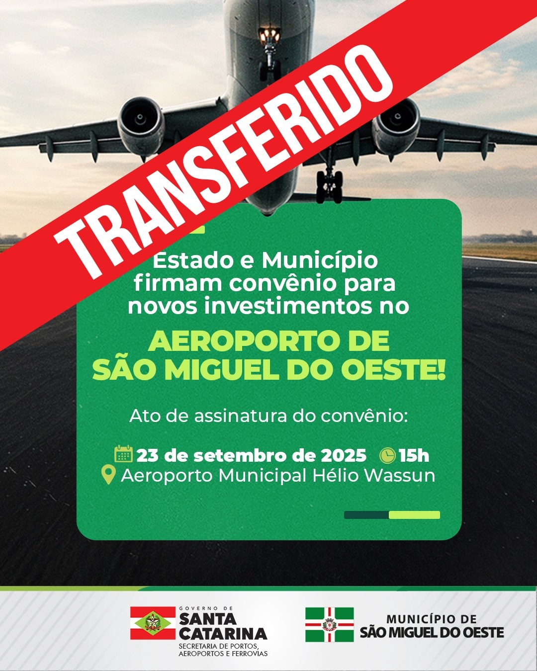 Última atualização: 2025/09/19 8:53:53A Administração Municipal de São Miguel do Oeste informa que o ato de assinatura do convênio entre o Governo do Estado de Santa Catarina e o Município de São Miguel do Oeste, para novos investimentos no Aeroporto Municipal Hélio Wassun, foi transferido para o dia 07 de outubro de 2025, às 15h, no próprio aeroporto.