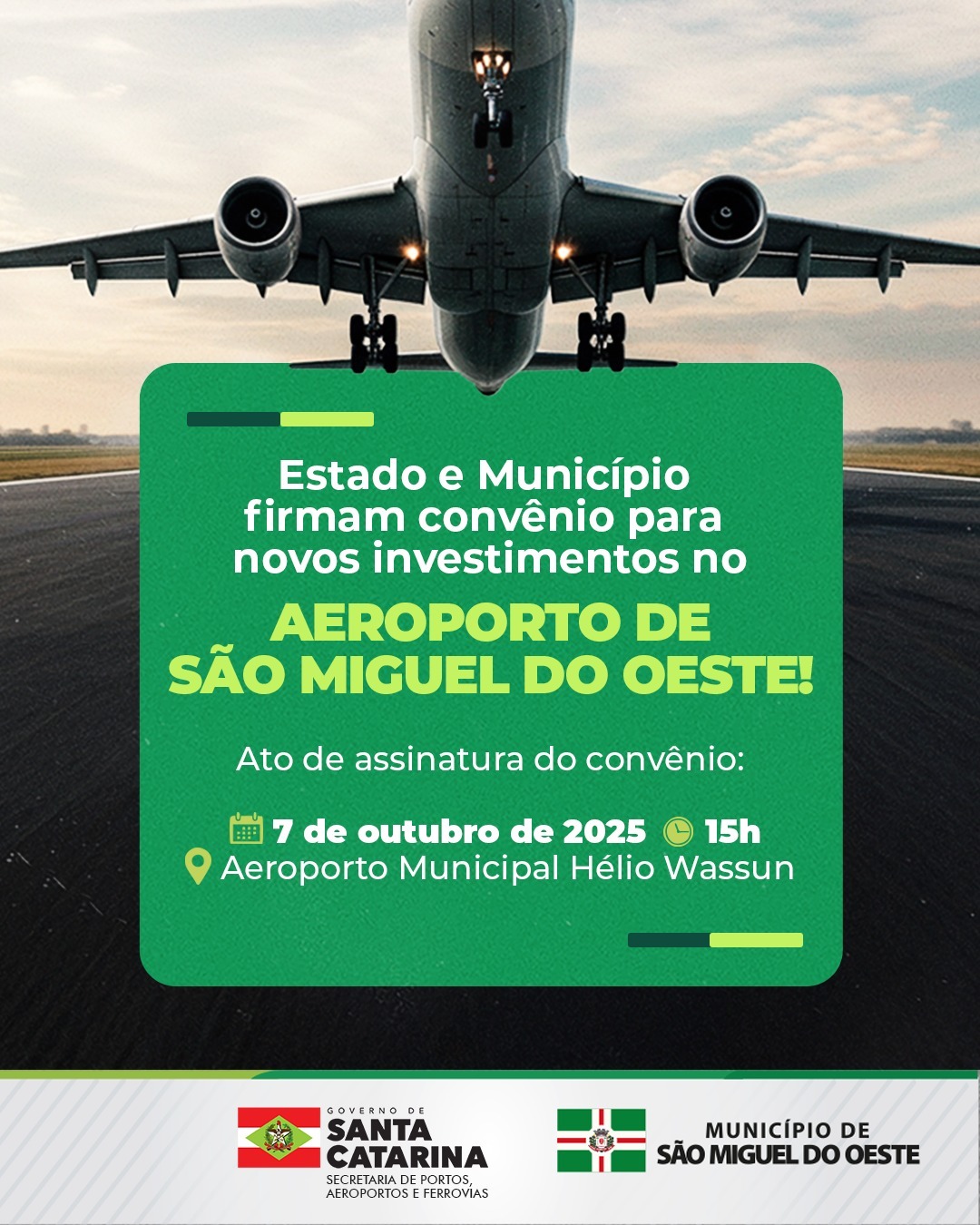 A Administração Municipal de São Miguel do Oeste informa que o ato de assinatura do convênio entre o Governo do Estado de Santa Catarina e o Município de São Miguel do Oeste, para novos investimentos no Aeroporto Municipal Hélio Wassun, ocorre nesta terça-feira (7), às 15h, no aeroporto.
