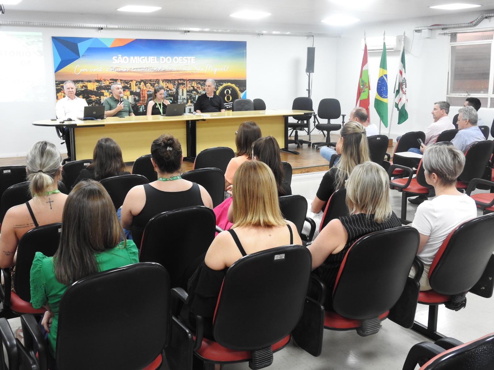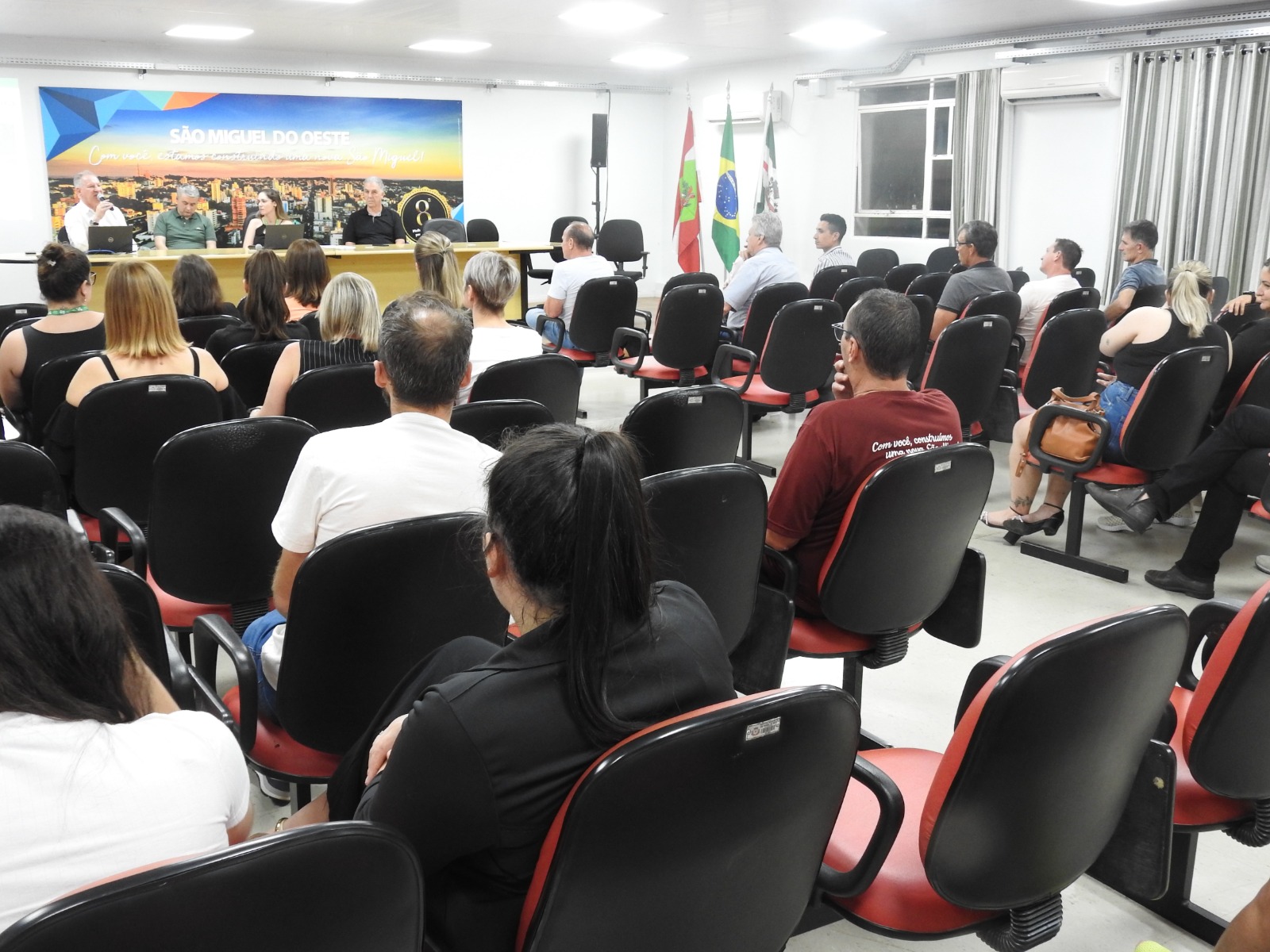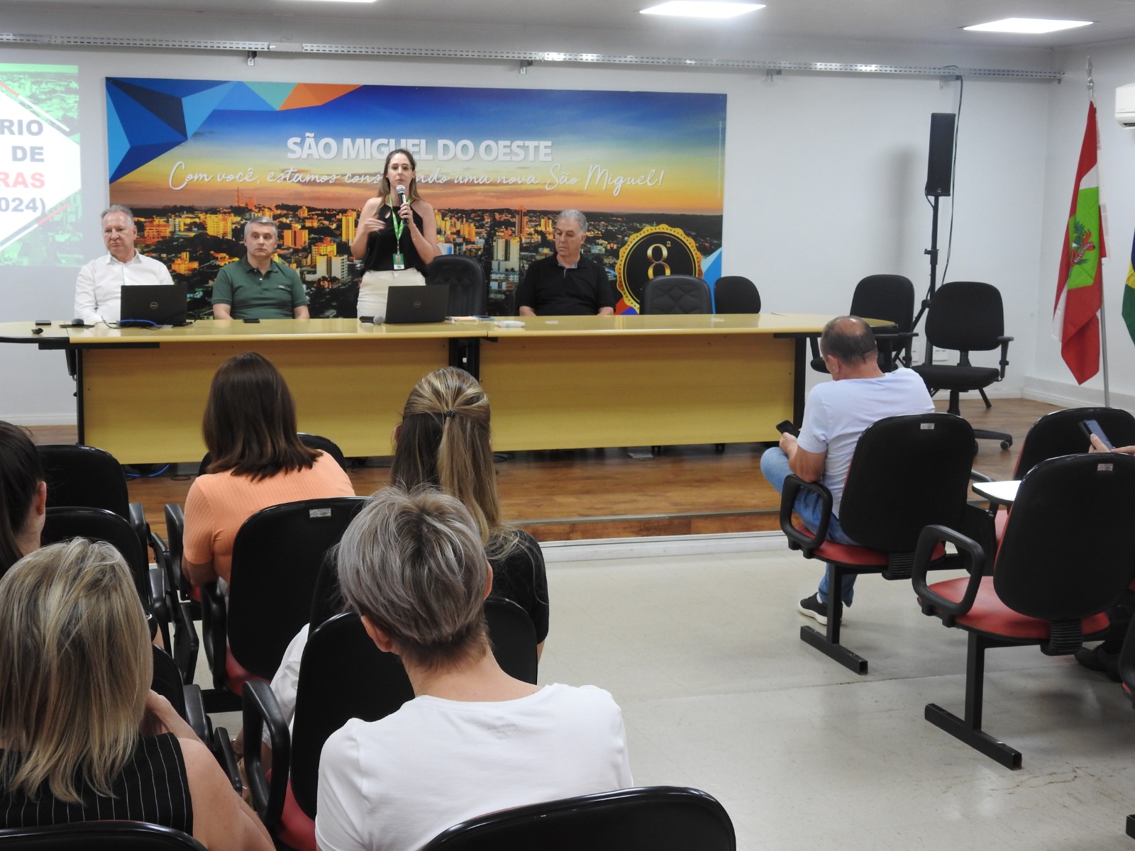 Cerca de 50 pessoas participaram da Audiência Pública para Elaboração do Orçamento 2025, realizada pela Administração Municipal, a partir das 18h30 desta quinta-feira (24), no Salão Nobre da prefeitura de São Miguel do Oeste. O público foi composto por servidores, lideranças, representantes de entidades, associações de moradores e população em geral.