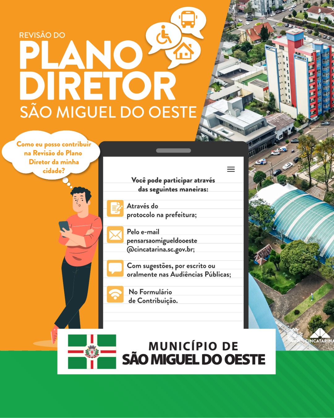 Última atualização: 2025/07/09 8:30:58O Município de São Miguel do Oeste, em colaboração com o Centro Interdisciplinar de Estudos e Projetos Urbanísticos de Santa Catarina (CINCATARINA), realizará uma audiência pública para discutir a Revisão do Plano Diretor Municipal. O evento está agendado para o dia 15 de julho de 2025, terça-feira, das 19h às 21h, no auditório do Centro Administrativo.