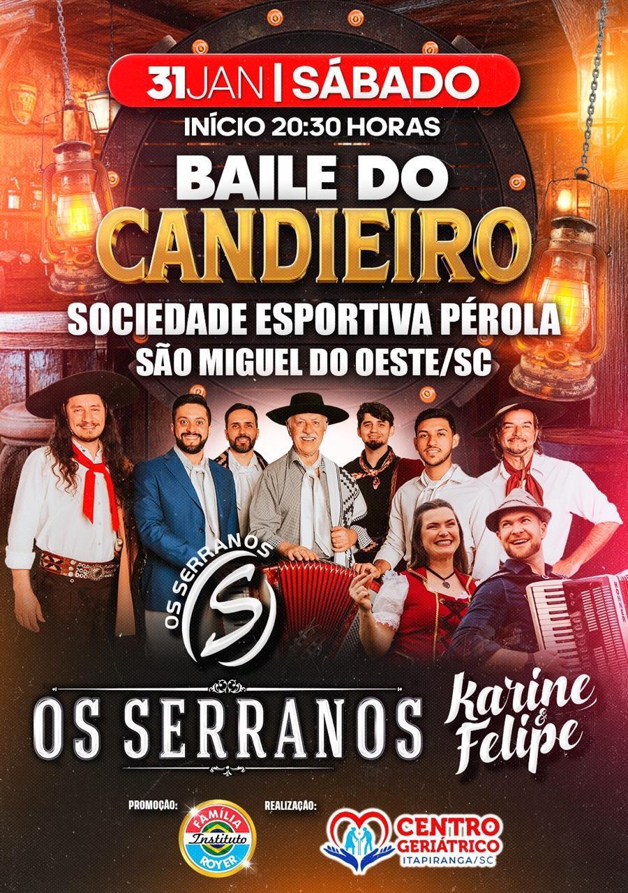 Última atualização: 2026/01/20 5:20:52O Baile do Candieiro será realizado no sábado, 31 de janeiro, a partir das 20h30, na Sociedade Esportiva Pérola, em São Miguel do Oeste. O evento contará com shows de Os Serranos e da dupla Karine & Felipe e tem como objetivo arrecadar recursos para o Centro Geriátrico de Itapiranga, que está em construção e terá mais de 100 leitos para atender idosos de toda a região.