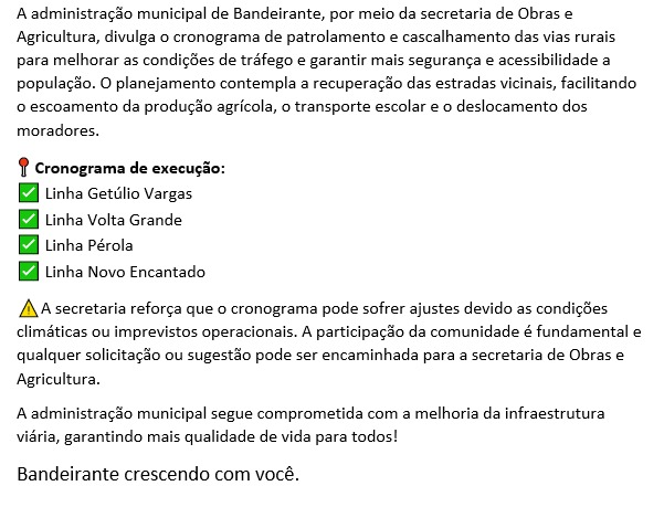 Última atualização: 2026/01/19 11:49:46A administração municipal de Bandeirante, por meio da Secretaria de Obras e Agricultura, divulgou o cronograma de patrolamento e cascalhamento das vias rurais. A ação tem como objetivo melhorar as condições de tráfego, aumentar a segurança e garantir mais acessibilidade aos moradores do interior.