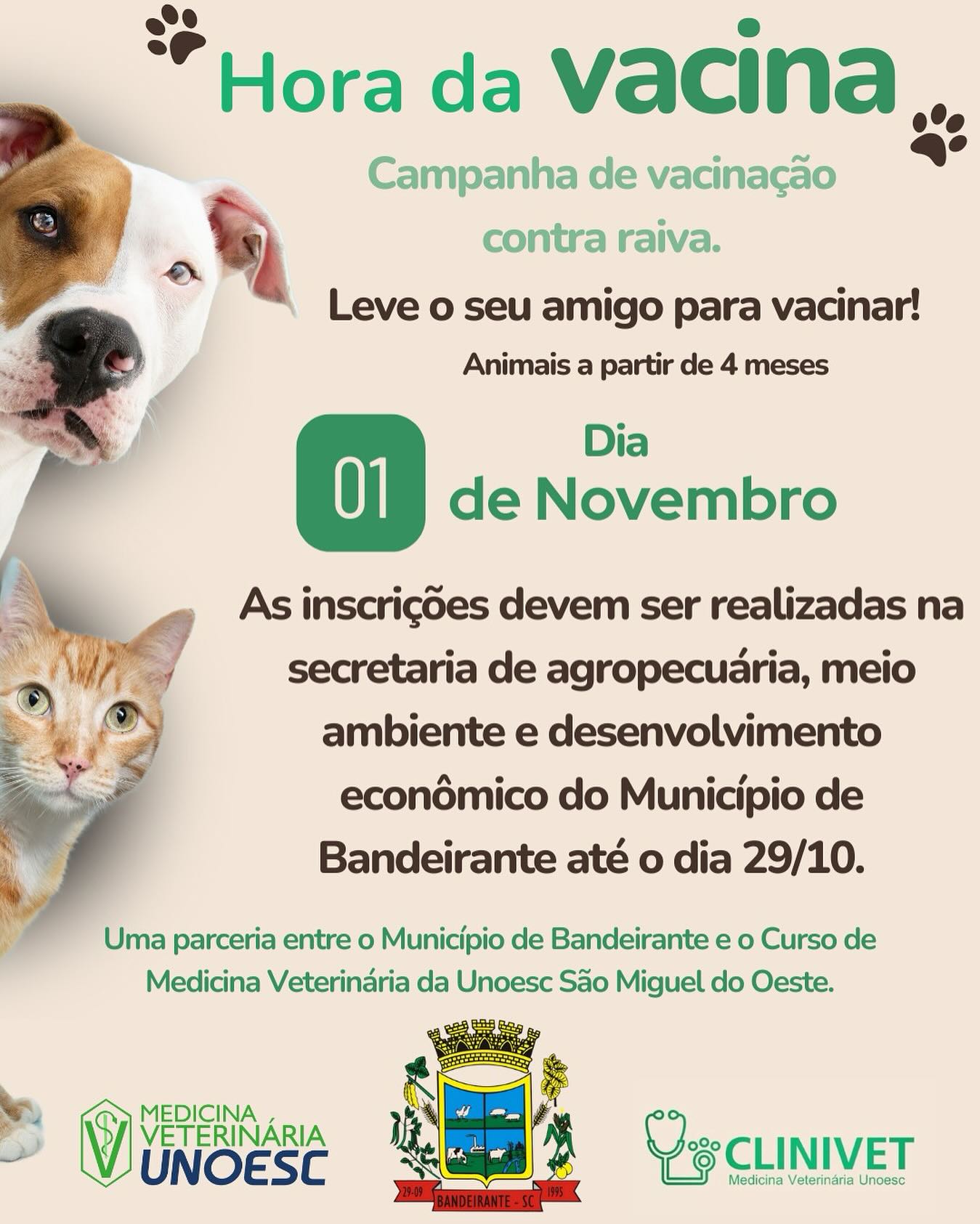 O município de Bandeirante realiza no dia 1º de novembro a campanha “Hora da Vacina”, voltada à imunização de cães e gatos contra a raiva. A iniciativa é uma parceria entre a Secretaria de Agropecuária, Meio Ambiente e Desenvolvimento Econômico e o curso de Medicina Veterinária da Unoesc São Miguel do Oeste.