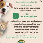 Última atualização: 2025/10/15 3:25:24O município de Bandeirante realiza no dia 1º de novembro a campanha “Hora da Vacina”, voltada à imunização de cães e gatos contra a raiva. A iniciativa é uma parceria entre a Secretaria de Agropecuária, Meio Ambiente e Desenvolvimento Econômico e o curso de Medicina Veterinária da Unoesc São Miguel do Oeste.