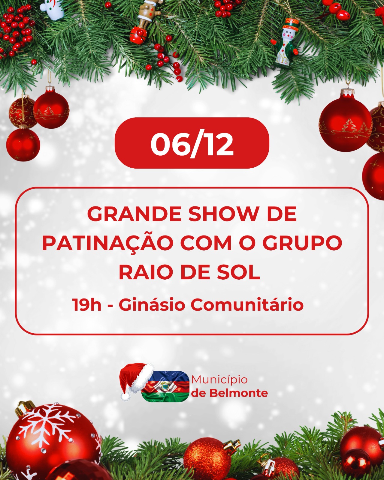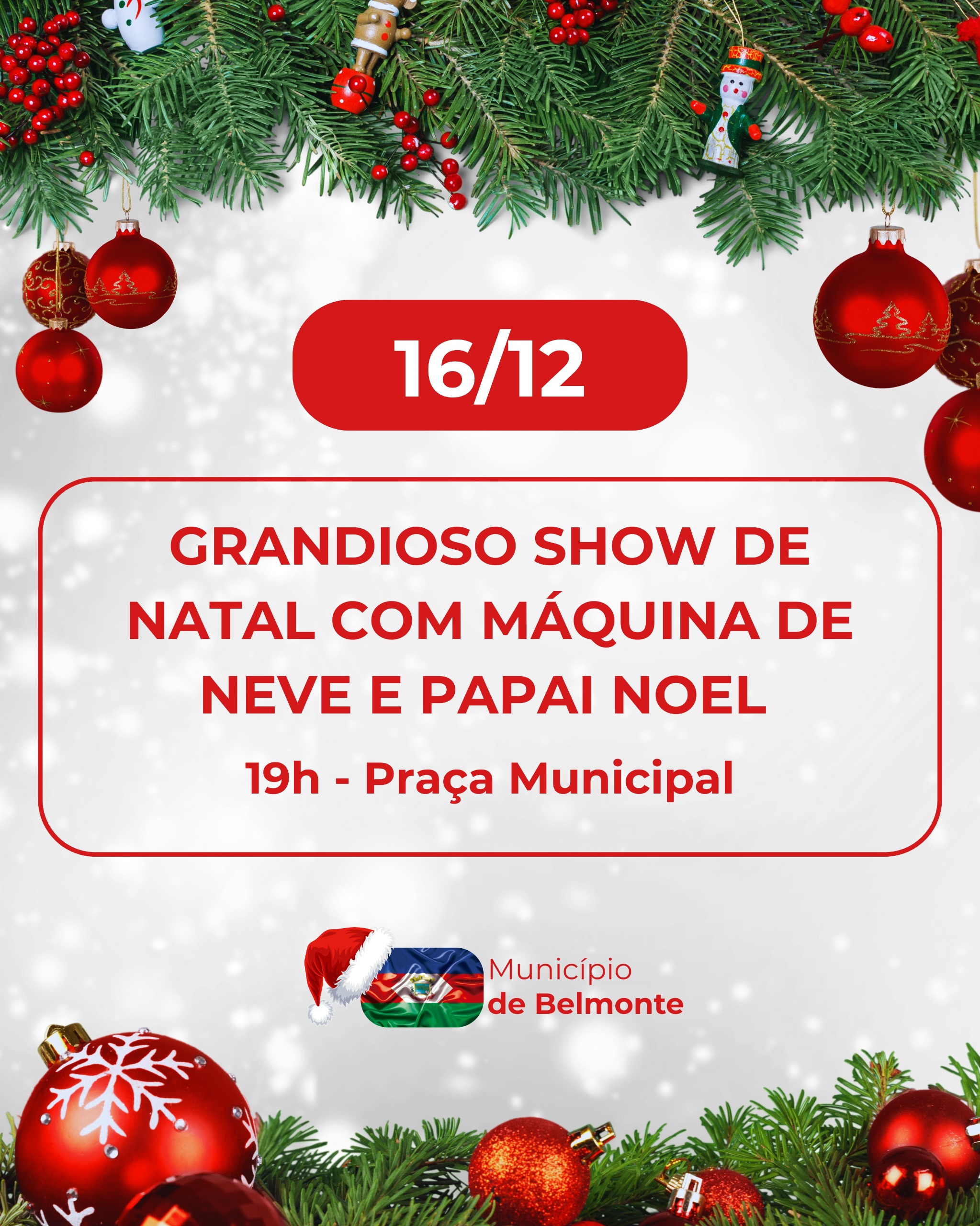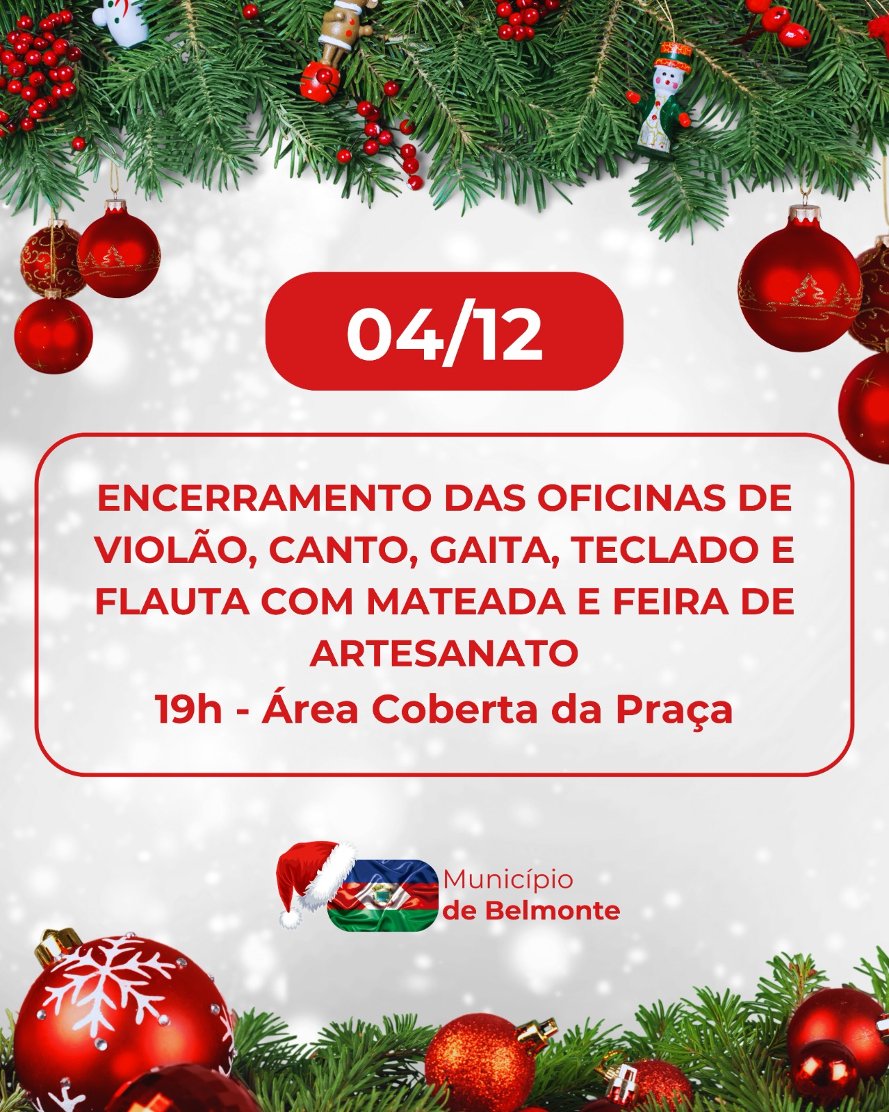 A Secretaria de Cultura e Esportes de Belmonte confirmou a programação oficial de fim de ano com o acendimento das luzes no dia 4 de dezembro e o show natalino marcado para o dia 16 de dezembro, ambos a partir das 19h na Praça Auzílio Bortoluzzi. As atividades encerram as oficinas de 2025, incluem exposição e venda de trabalhos de artesãos locais e reservam a chegada do Papai Noel como atração surpresa.