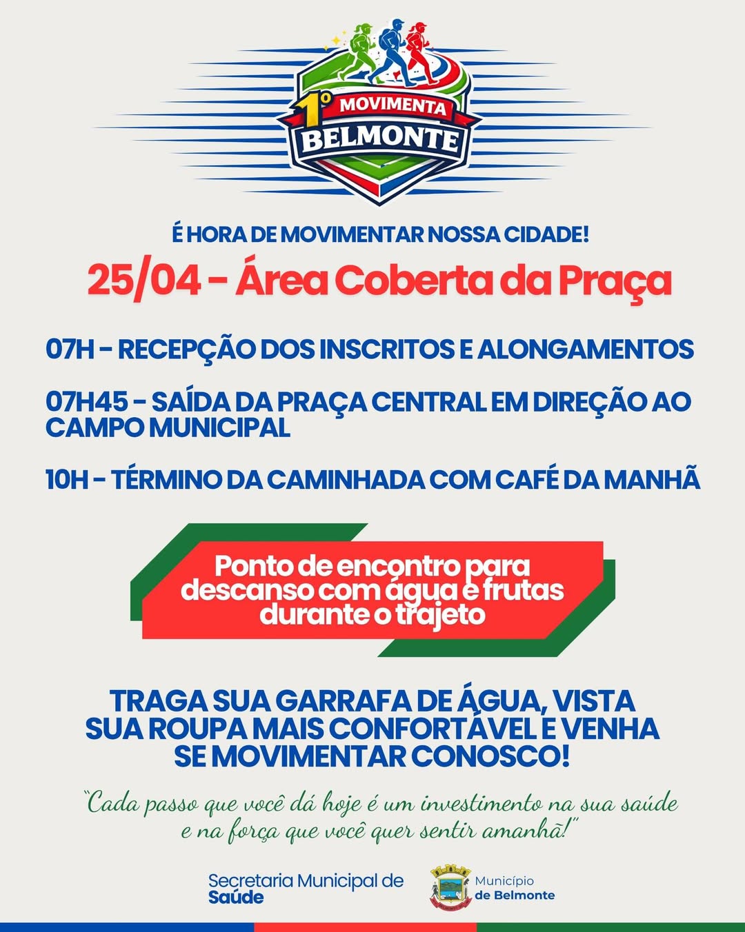 O municipio de Belmonte realizará no dia 25 de abril a primeira edição do “Movimenta Belmonte”, uma caminhada voltada à promoção da saúde, bem-estar e integração entre os moradores. A proposta é simples, mas estratégica: tirar a comunidade da rotina, incentivar hábitos saudáveis e fortalecer os laços entre famílias e amigos.