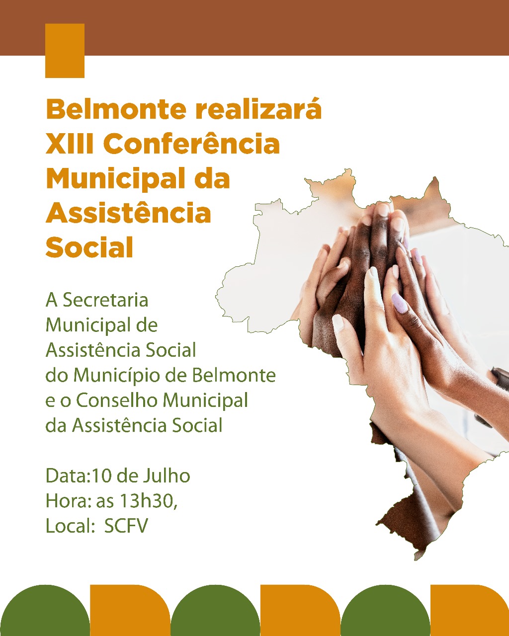 A cidade de Belmonte promoverá, no dia 10 de julho, a XIII Conferência Municipal da Assistência Social. O evento, organizado pela Secretaria Municipal de Assistência Social e pelo Conselho Municipal da Assistência Social, será realizado no Serviço de Convivência e Fortalecimento de Vínculos (SCFV), com início às 13h30.