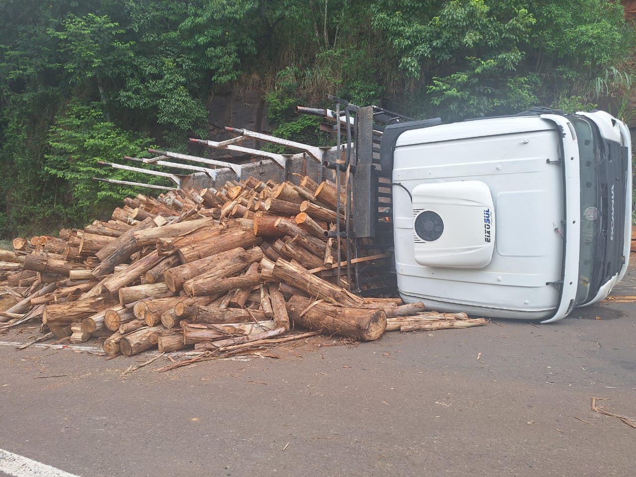 Um caminhão carregado com madeira tombou na SC-161 após ficar sem freios, na manhã desta sexta-feira, dia 16, em Flor do Sertão, no Oeste catarinense. O motorista de 41 anos e único ocupante saiu ileso do acidente.