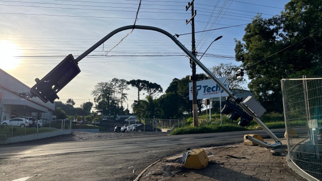 De acordo com informações apuradas no local, o caminhão trafegava pela rua Arnô Éric Schwanback e, ao fazer a conversão em direção ao trevo da cidade, colidiu com o semáforo. O impacto fez com que o equipamento ficasse pendurado apenas pelos cabos, gerando risco iminente a pedestres e motoristas que circulavam pela via.
