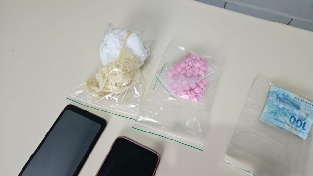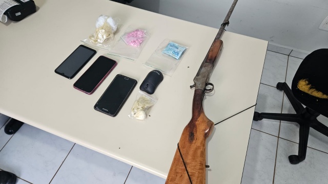 Ao todo foram apreendidos 98 comprimidos de ecstasy, 12 gramas de cocaína, uma espingarda calibre.32, uma balança de precisão, dois telefones de aparelho celular, um tablet e dinheiro em espécie, sendo tudo entregue na Delegacia de Polícia Civil.