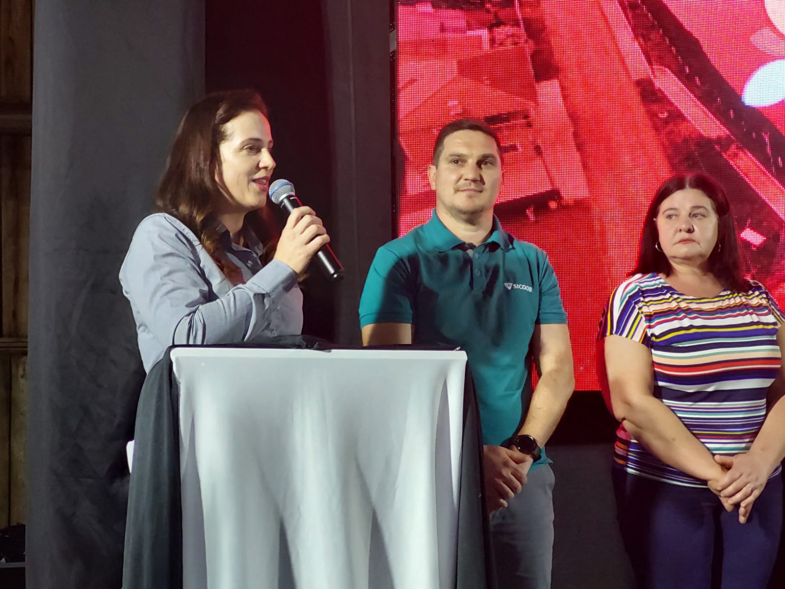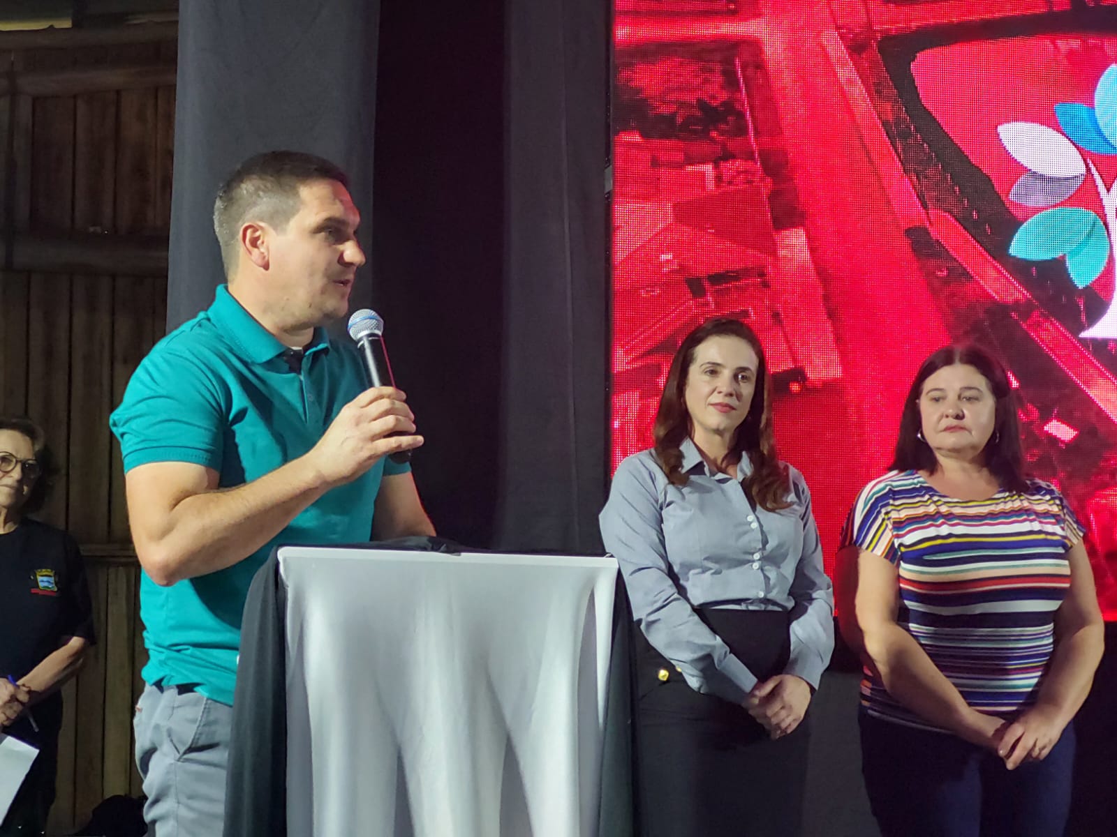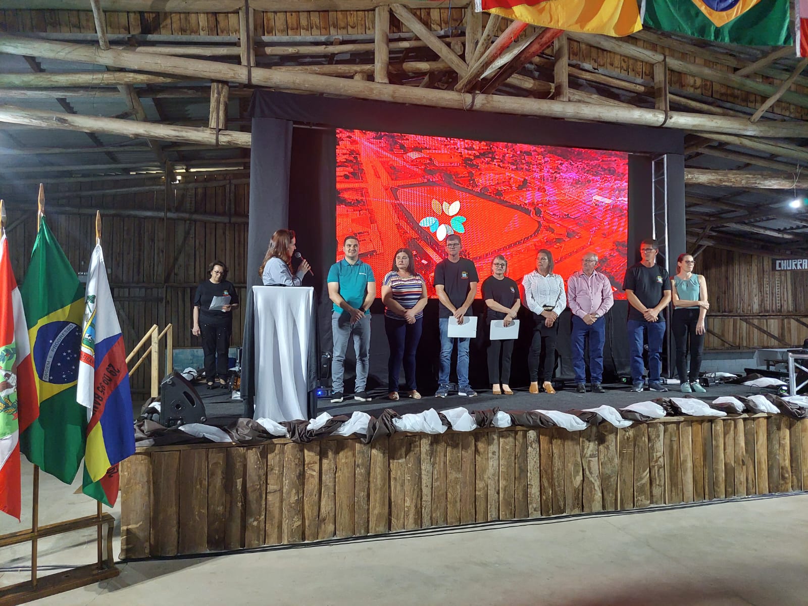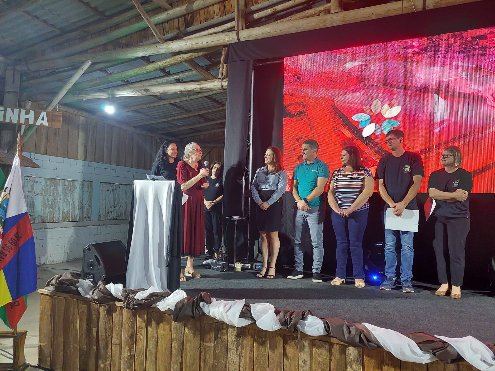Durante o ato, a pioneira Liboria Michel subiu a palco para destacar seu orgulho em viver no município. A feira é uma realização da prefeitura de Bandeirante e tem o patrocínio oficial do Sicoob São Miguel.