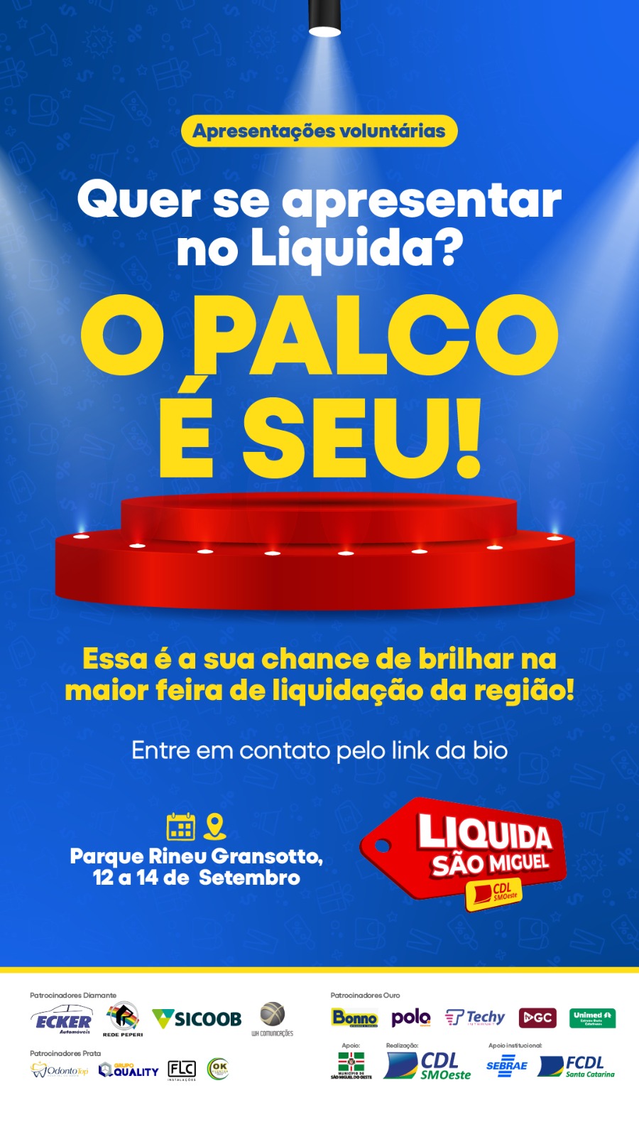 A CDL de São Miguel do Oeste está com inscrições abertas para artistas locais profissionais que queiram se apresentar no palco do Liquida São Miguel 2025, o maior feirão de liquidação do Extremo Oeste catarinense. O evento acontece de 12 a 14 de setembro, no Parque Rineu Gransotto, e em 2024 reuniu mais de 20 mil visitantes durante os três dias de programação.