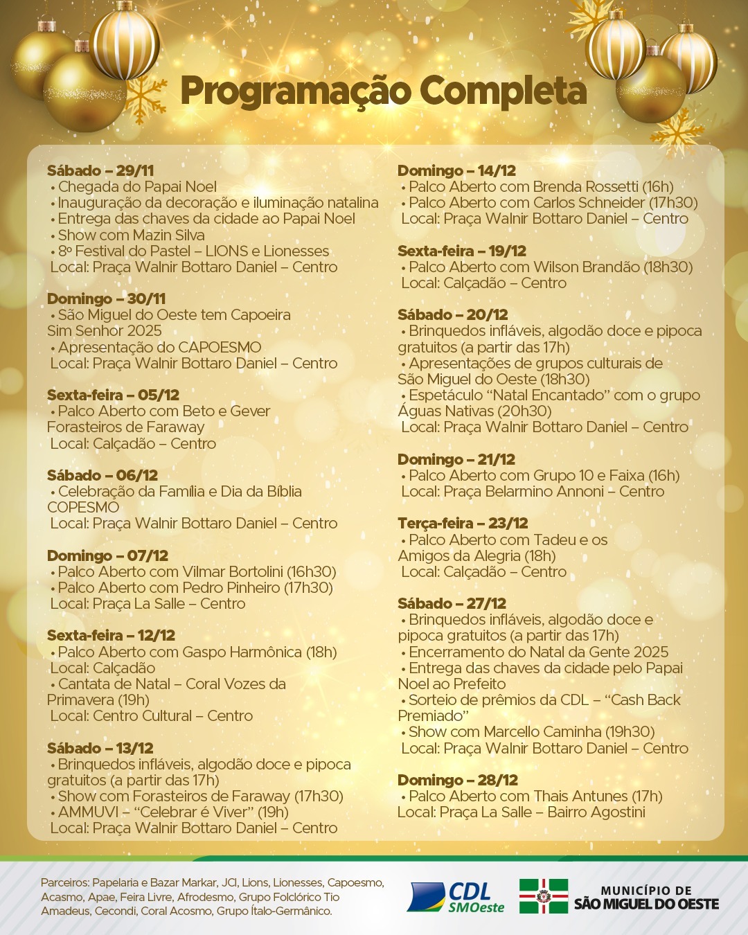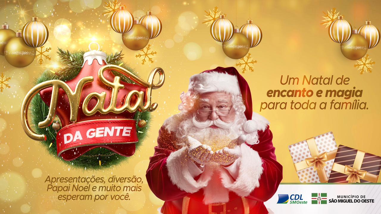 Última atualização: 2025/11/21 9:22:52A CDL São Miguel do Oeste e a Prefeitura estão promovendo o especial “Natal Iluminado”, que conta com uma programação especial que aposta em experiências culturais, atrações para todas as idades e ações que reforçam o espírito de união característico desta época do ano. A chegada do Papai Noel, apresentações artísticas, eventos de rua e iniciativas comunitárias compõem um calendário que busca transformar o centro e os bairros em espaços de convivência e celebração.