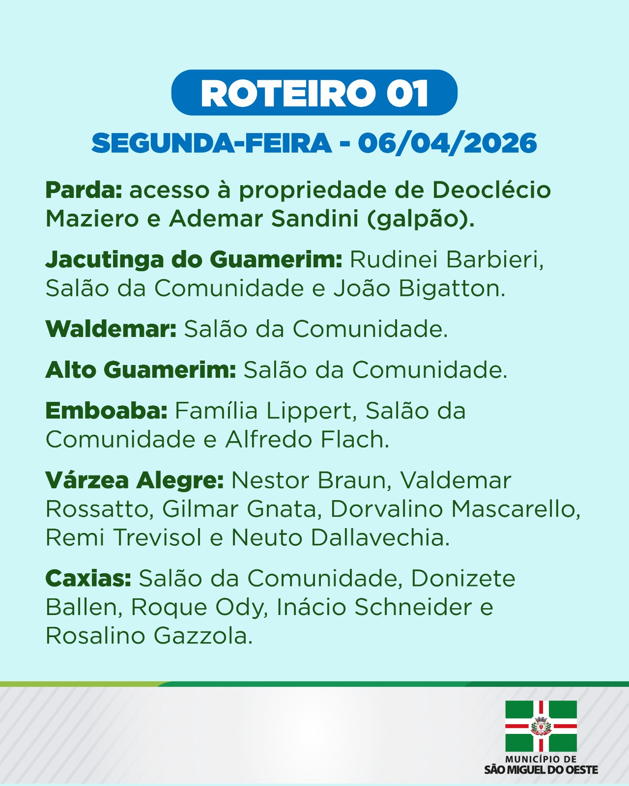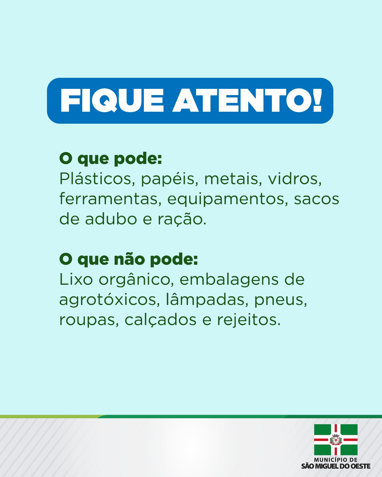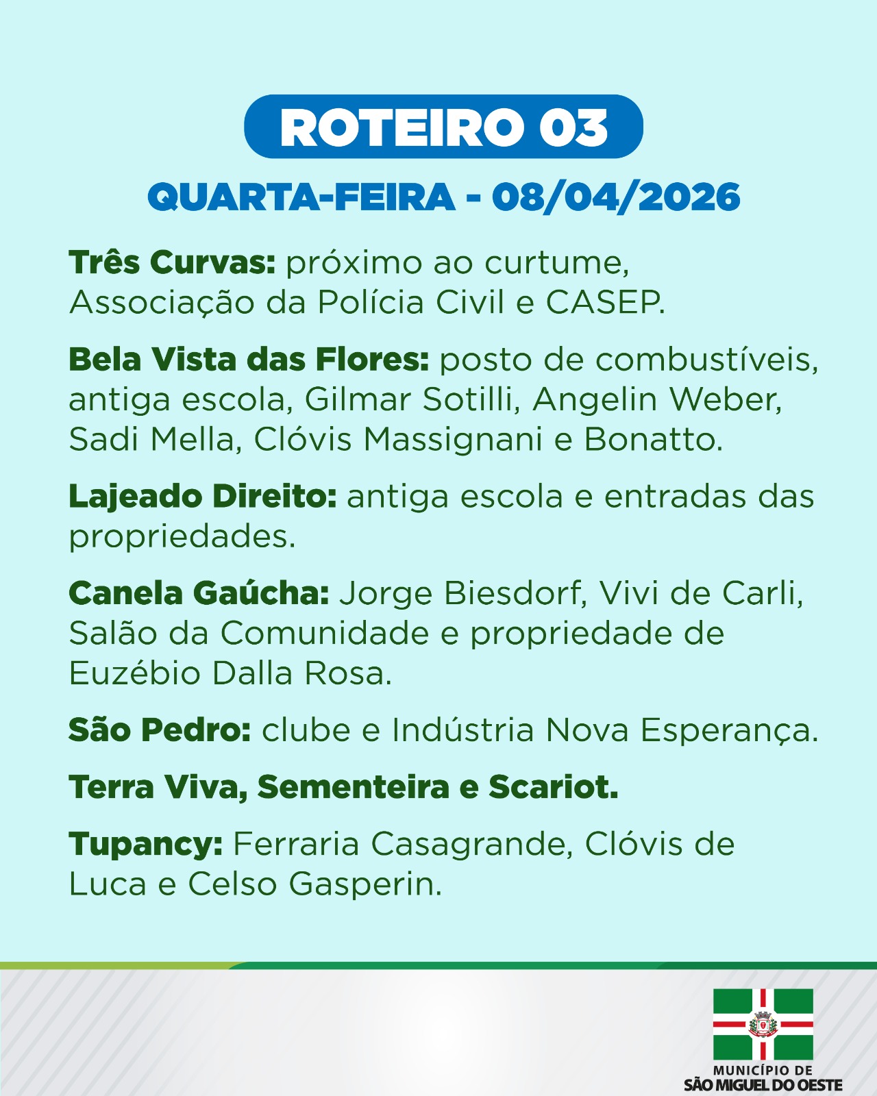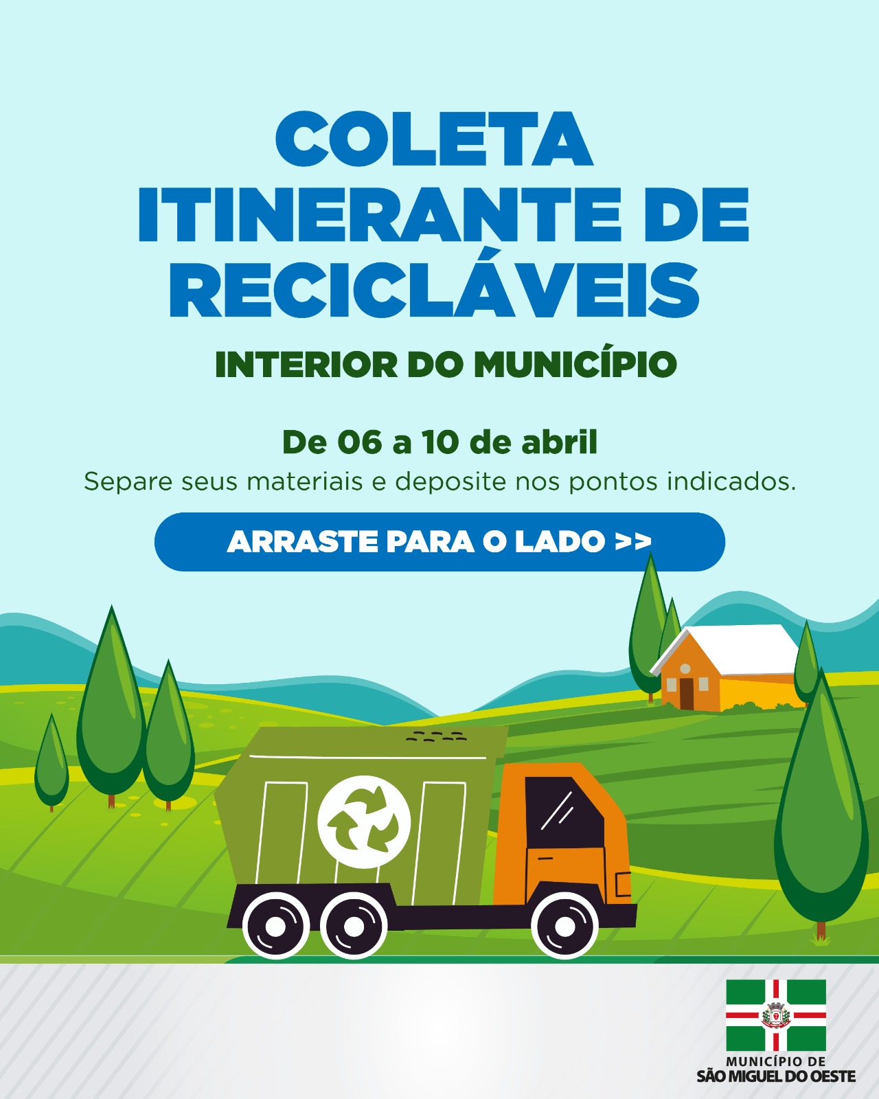 Última atualização: 2026/04/06 9:22:25A Administração Municipal de São Miguel do Oeste inicia nesta segunda-feira, dia 6 de abril, a coleta itinerante de materiais recicláveis nas comunidades do interior. A ação segue até o dia 10 de abril e tem como objetivo facilitar o descarte correto de resíduos no meio rural.