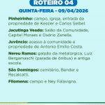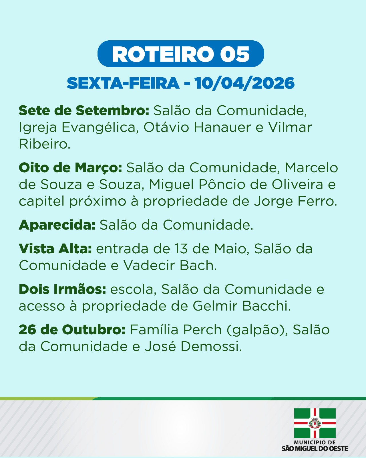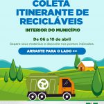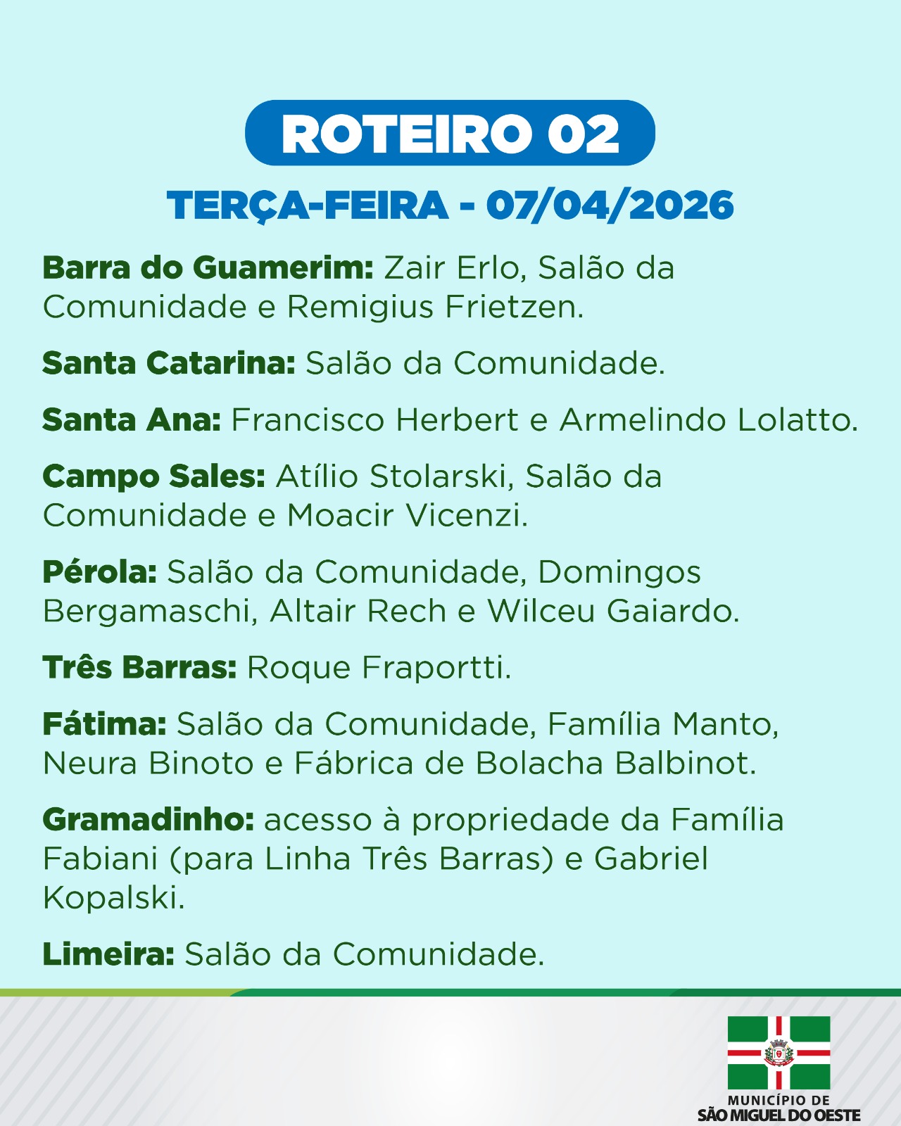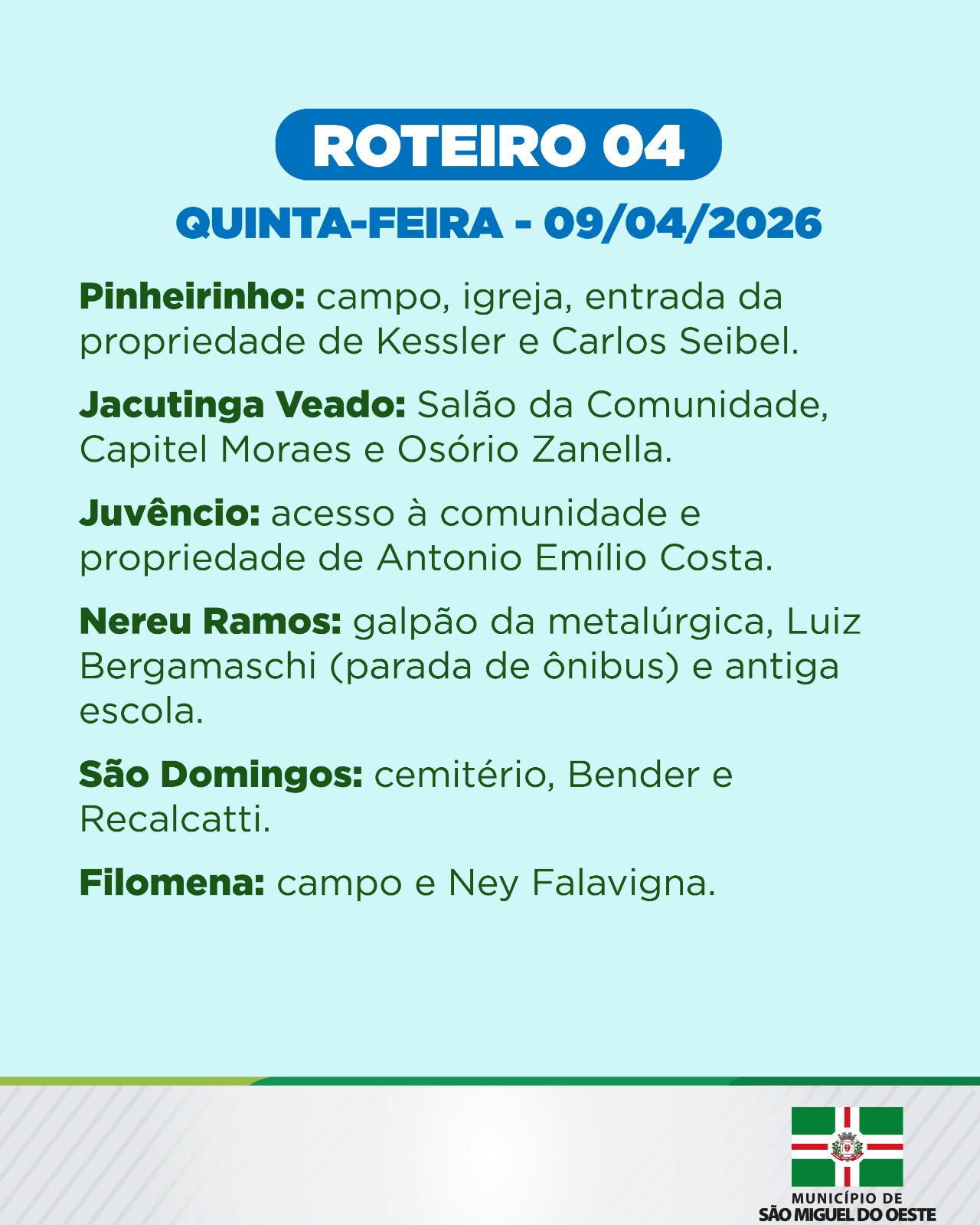 Última atualização: 2026/04/06 9:22:25A Administração Municipal de São Miguel do Oeste inicia nesta segunda-feira, dia 6 de abril, a coleta itinerante de materiais recicláveis nas comunidades do interior. A ação segue até o dia 10 de abril e tem como objetivo facilitar o descarte correto de resíduos no meio rural.