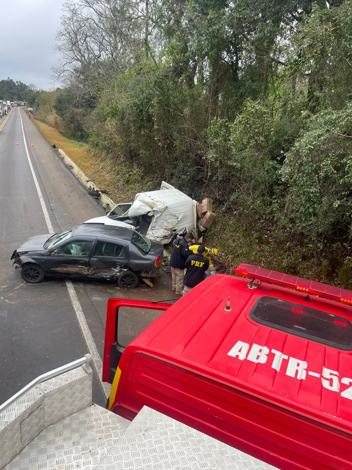 Um grave acidente de trânsito foi registrado por volta das 12h30 desta sexta-feira (8) no km 528 da BR-282, em Xaxim, no trecho que liga o município a Cordilheira Alta, no Oeste catarinense. A colisão envolveu cinco veículos, entre eles uma van e carros de passeio. Uma pessoa morreu no local e outras ficaram feridas.