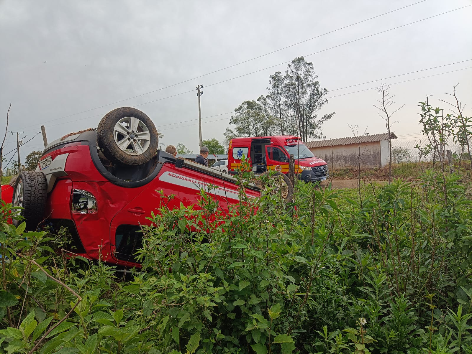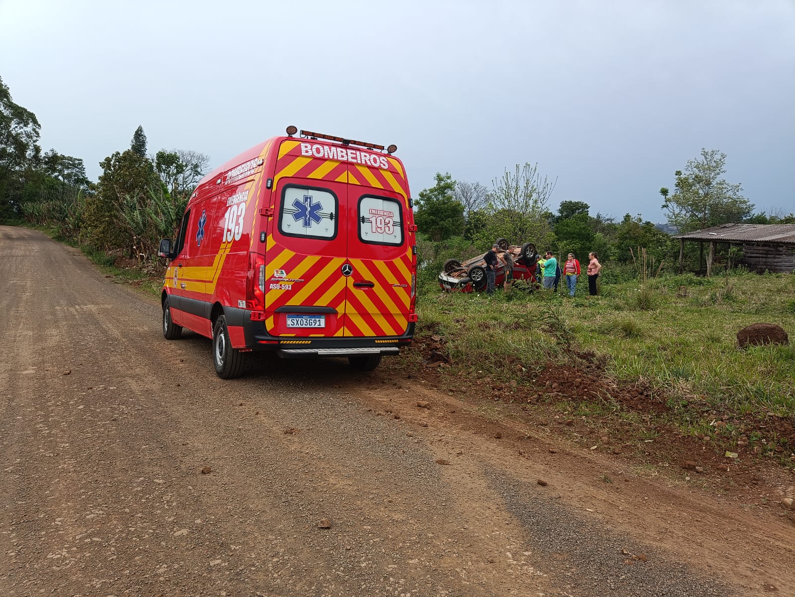 Última atualização: 2025/09/30 10:57:28O Corpo de Bombeiros Militar de Guaraciaba atendeu na manhã desta terça-feira(30), um acidente de trânsito na comunidade de Linha Alto Caçador, interior de Barra Bonita. A ocorrência, registrada às 8h32, envolveu um Volkswagen Fox que saiu da pista e capotou.