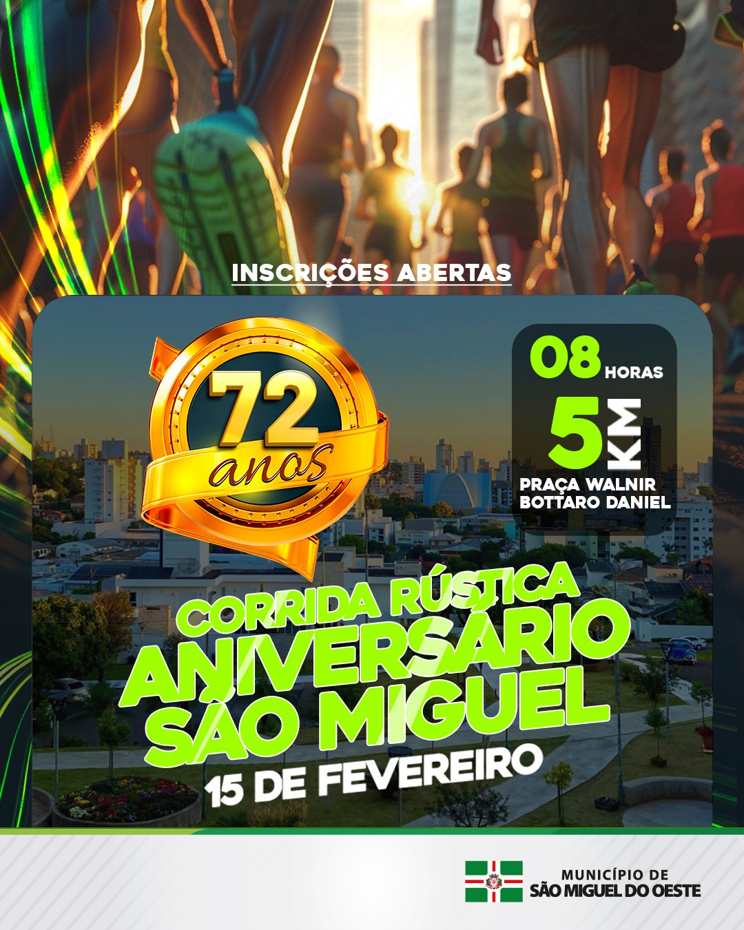 Última atualização: 2026/01/20 10:09:43Estão abertas as inscrições para a Corrida Rústica em comemoração aos 72 anos de São Miguel do Oeste, que será realizada no dia 15 de fevereiro, com largada às 8h, na Praça Walnir Bottaro Daniel.