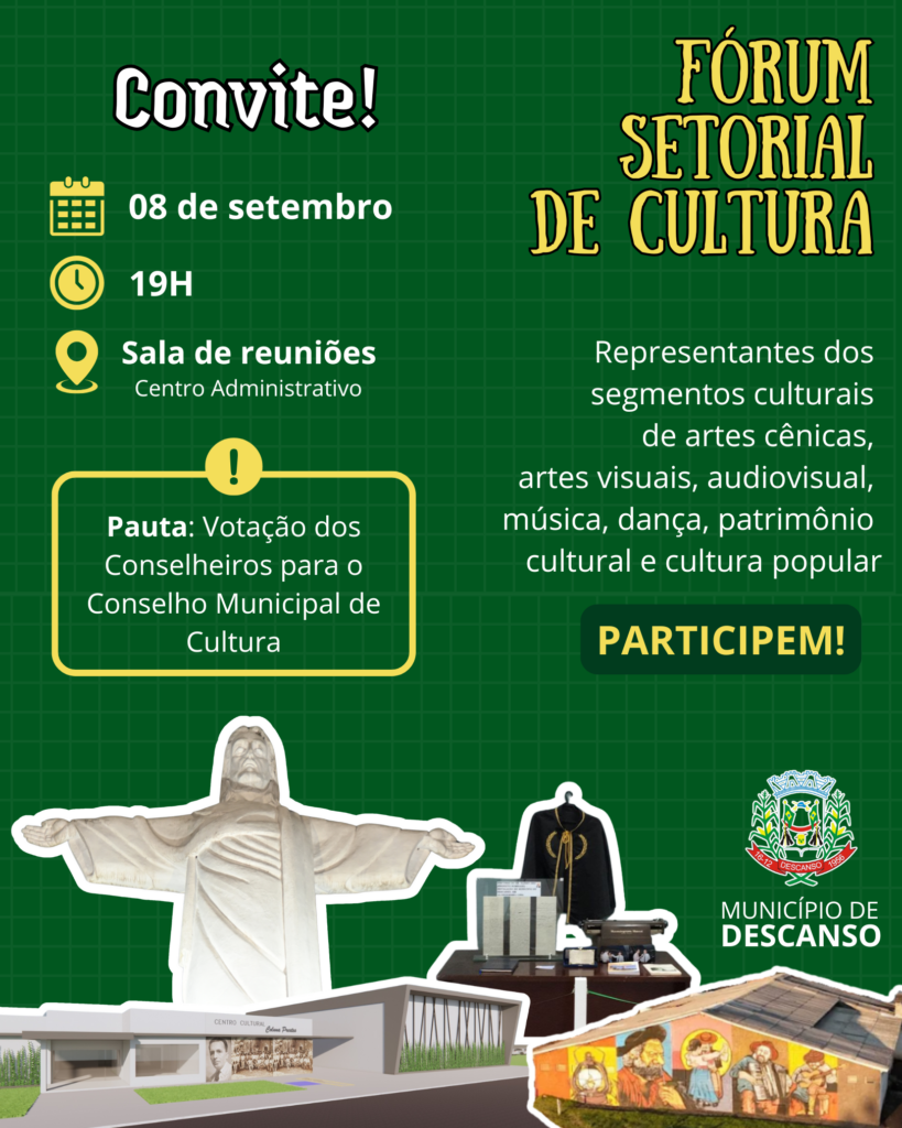 Última atualização: 2025/08/08 8:44:33A Prefeitura de Descanso, por meio da Secretaria Municipal de Educação e Cultura, anunciou a realização do Fórum Setorial de Cultura, marcado para o dia 8 de setembro de 2025, às 19h, na sala de reuniões da sede do Executivo municipal. O encontro tem como objetivo escolher os representantes da sociedade civil que irão compor o Conselho Municipal de Cultura, instituído pela Lei nº 2074/2024.