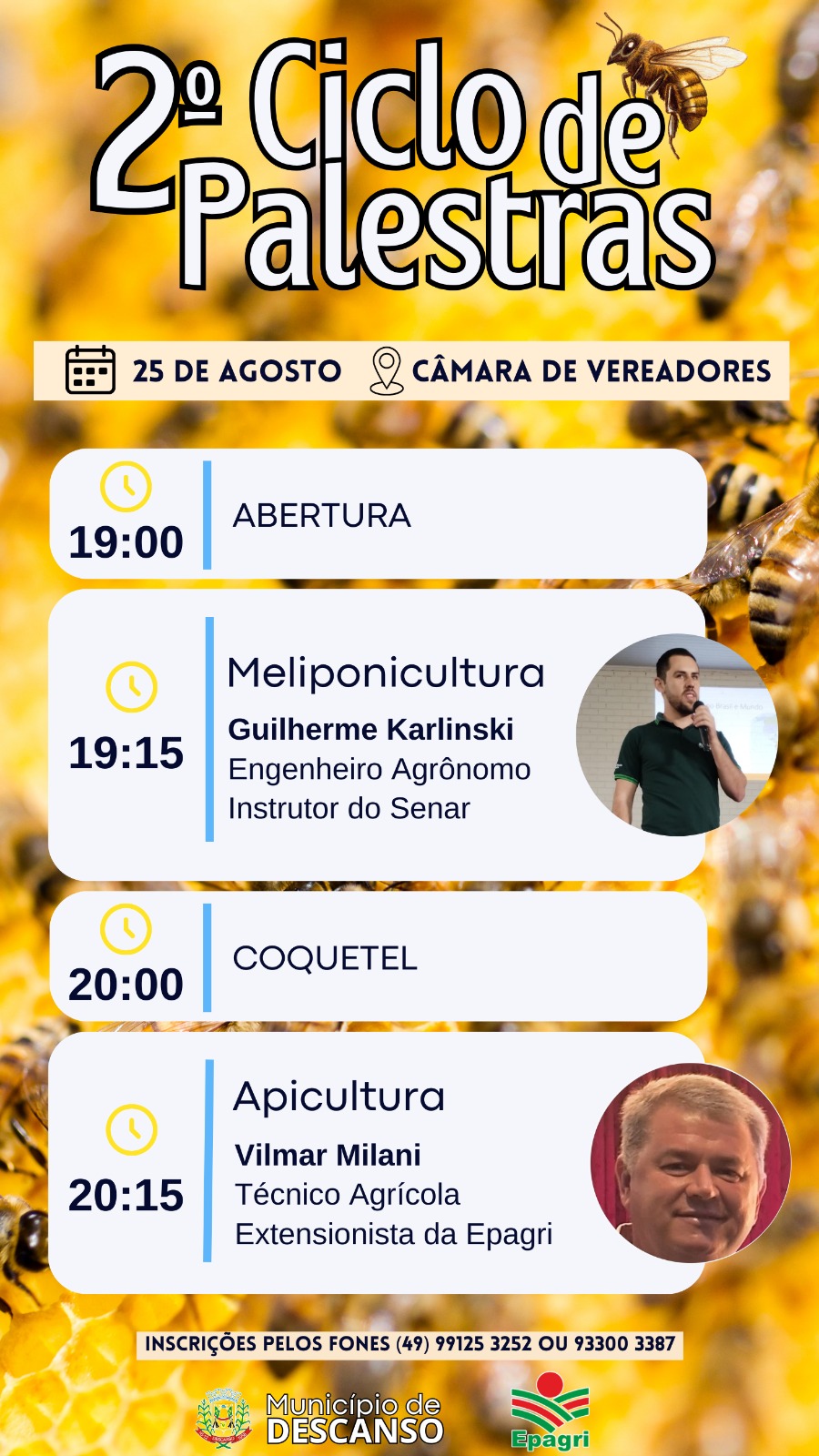 Última atualização: 2025/08/18 4:07:10A Secretaria da Agricultura de Descanso, em parceria com a Epagri, está organizando o 2º Ciclo de Palestras, que será realizado no dia 25 de agosto, a partir das 19h, na Câmara de Vereadores, um evento voltado ao fortalecimento do setor agrícola e à troca de conhecimentos sobre a produção de mel e o manejo de abelhas. A participação será mediante a confirmação da presença pelos telefones (49) 99125-3252 ou (49) 93300-3387.