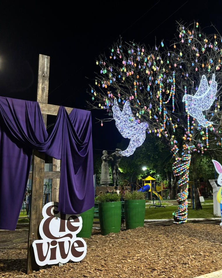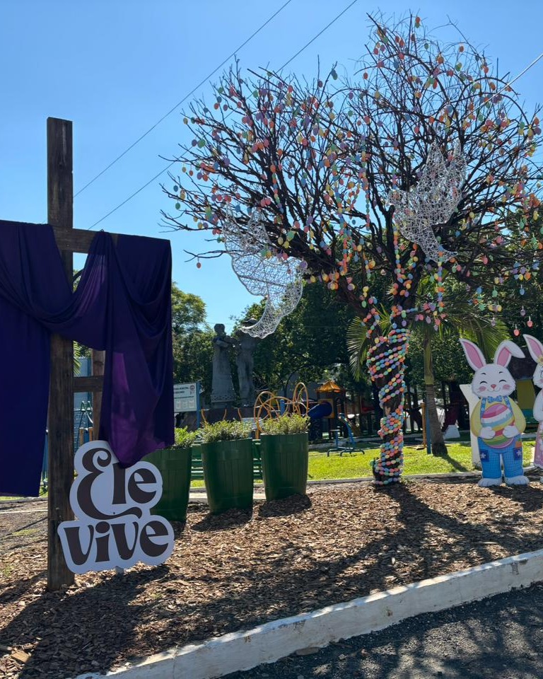Outro ponto de grande destaque foi o cenário montado na Praça Municipal, que reuniu a simbologia cristã com elementos tradicionais da cultura pascal. As três cruzes, instaladas em frente à Igreja Matriz de Descanso, chamaram a atenção pela representação da fé e da reflexão, enquanto a tradicional árvore de Páscoa — conhecida como Osterbaum — encantou o público com seus ovos coloridos e decoração vibrante.