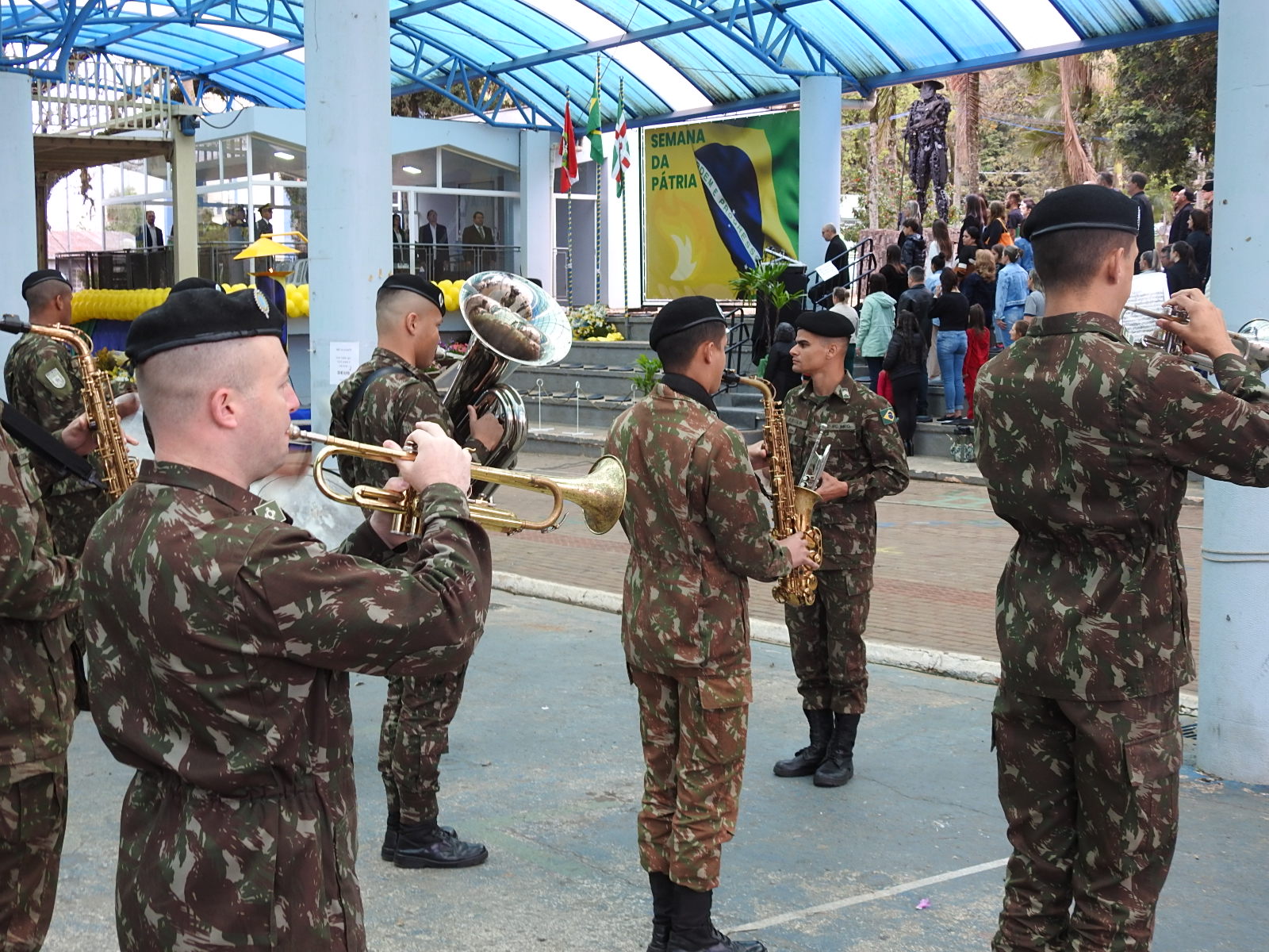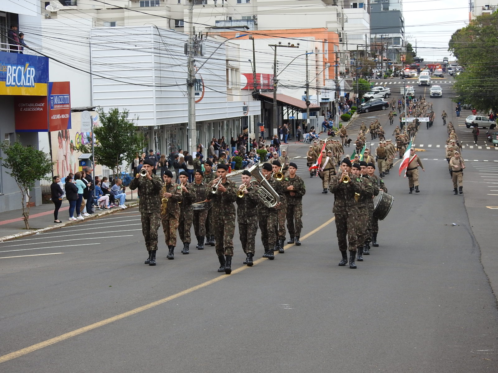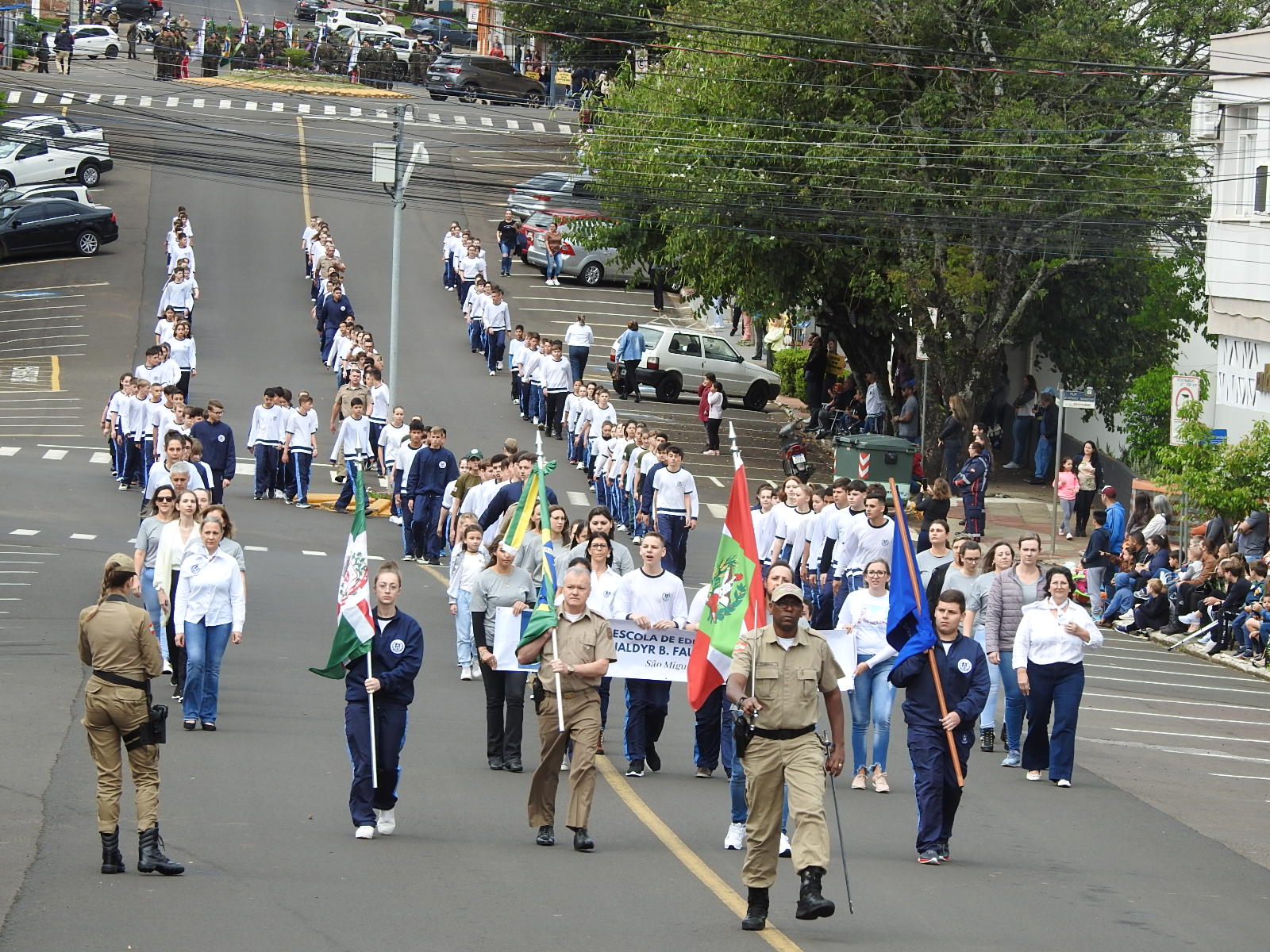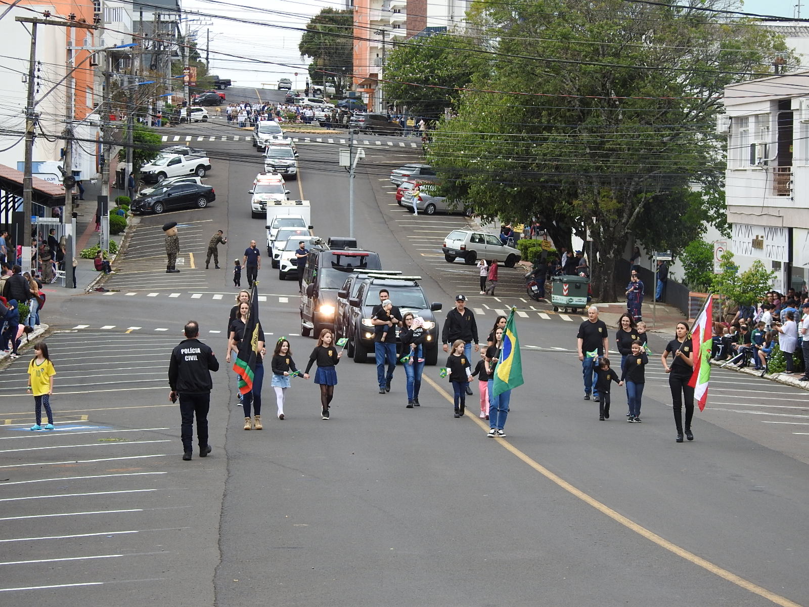 Centenas de pessoas acompanharam o Desfile Militar que marcou o 07 de Setembro, na manhã desta quinta-feira, em São Miguel do Oeste. A programação iniciou ainda às 8h, com o Hasteamento das Bandeiras na Praça Walnir Bottaro Daniel, pelo prefeito, Wilson Trevisan; juiz da Vara Criminal, Marcio Cristófoli; e presidente da Câmara de Vereadores, Paulo Drumm. Também foi tocado o Hino Nacional e realizada Hora Cívica, a cargo da Banda Municipal.