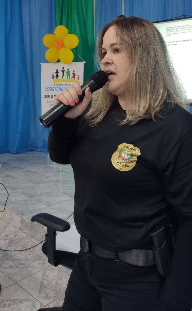 Na tarde de quinta-feira (18), a Escrivã de Polícia Aline Massoni, lotada na Delegacia de Proteção à Criança, Adolescente, Mulher e Idoso de São Miguel do Oeste (DPCAMI/SMO), esteve presente em um importante evento no município de Princesa. A iniciativa, realizada em parceria com a Assistência Social local, teve como objetivo promover a conscientização e o combate ao abuso e à exploração sexual de crianças e adolescentes.