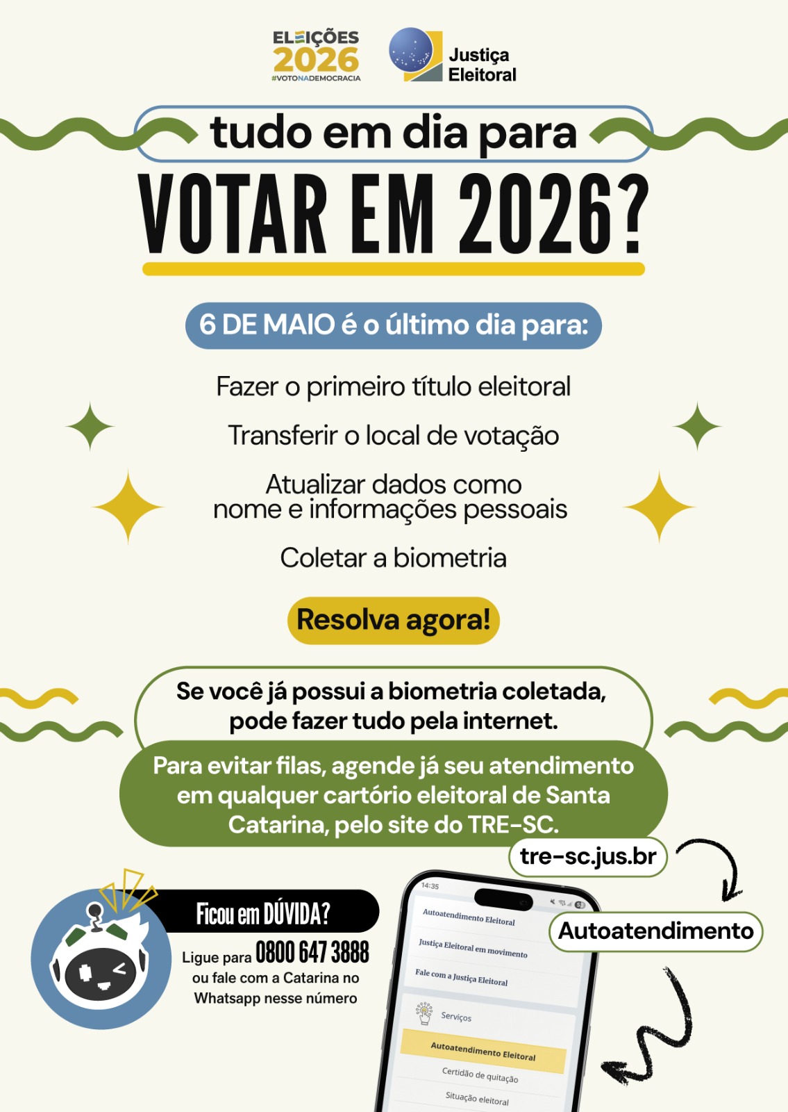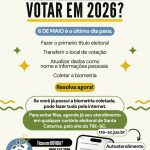 Última atualização: 2026/04/23 5:32:04Com a proximidade das eleições, a Justiça Eleitoral reforça que os eleitores têm até o dia 6 de maio para regularizar a situação, seja para fazer o primeiro título, atualizar dados, transferir o domicílio eleitoral ou realizar a biometria, já que após essa data o cadastro será fechado para que o órgão possa organizar todas as etapas do processo eleitoral, como definição das listas de votação e preparação das seções.