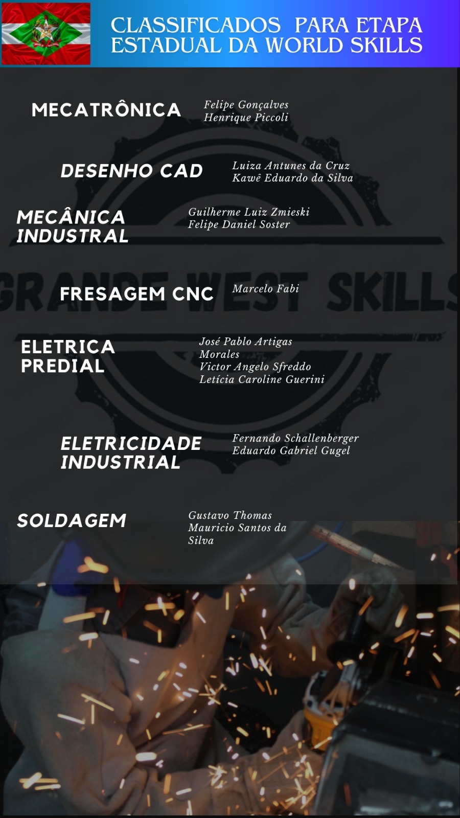Na modalidade de Soldagem, Gustavo Thomas obteve a maior pontuação. O professor Roberto Ecker ressaltou que a prova envolveu a montagem e soldagem de um vaso de pressão, utilizando eletrodo 7018, processo MAG (MIGMAG) e TIG. O vaso soldado por Gustavo suportou uma pressão de 2000 psi, demonstrando a qualidade de sua soldagem.