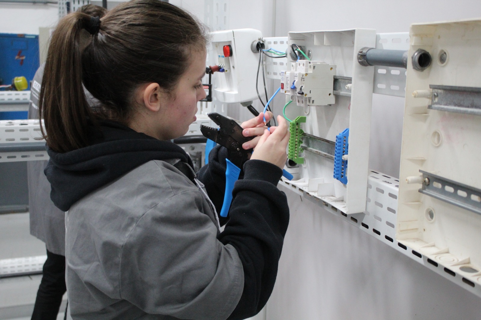 Letícia Caroline Guerini, estudante do terceiro semestre de Eletromecânica, conquistou o terceiro lugar em Elétrica Predial. O professor Edson Gustavo da Silva explica que a prova exigia a montagem e teste de um circuito em até 4 horas e Letícia demonstrou grande habilidade técnica.