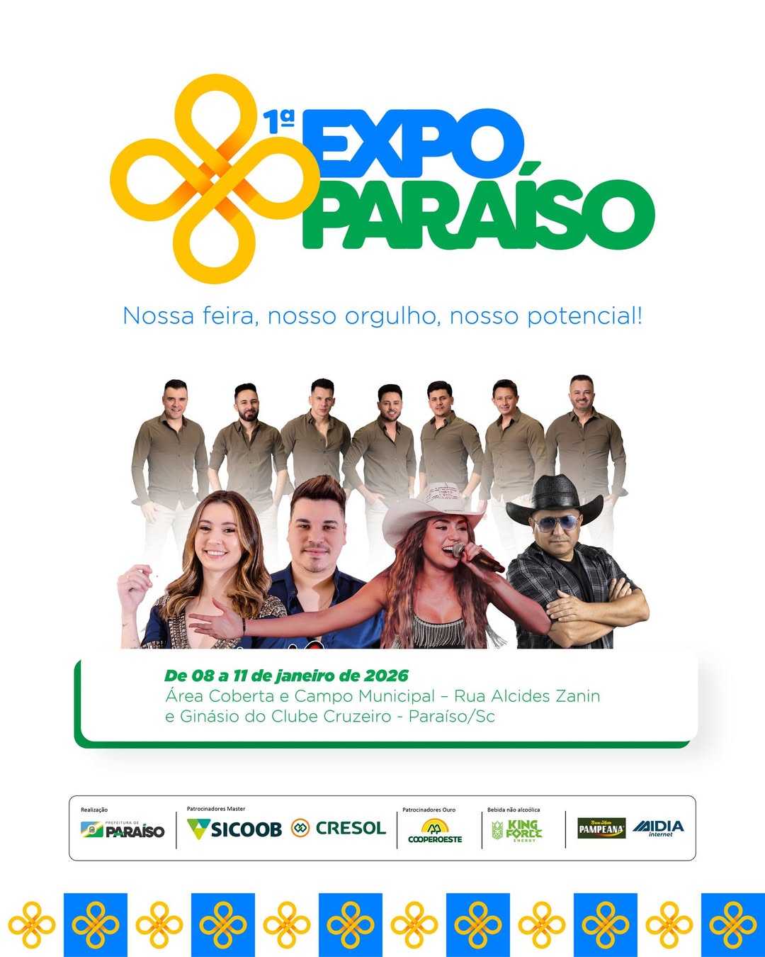 De 8 a 11 de janeiro, o município de Paraíso realiza a primeira edição da Expo Paraíso 2026, com programação musical aberta ao público. O evento será realizado na área coberta e no Campo Municipal, na Rua Alcides Zanin, e no Ginásio do Clube Cruzeiro.