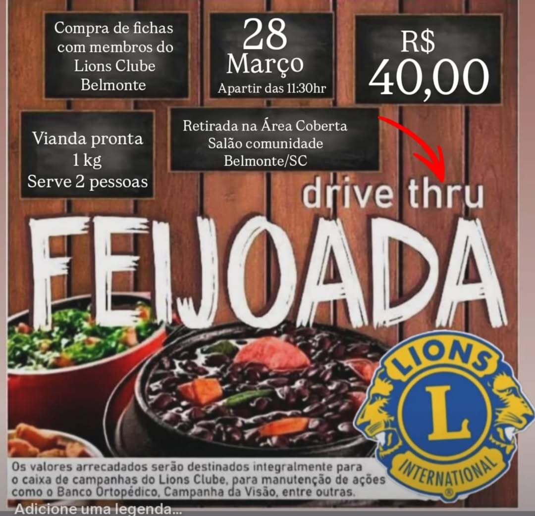 A comunidade de Belmonte poderá participar neste sábado, 28 de março, da 1ª Feijoada do Lions Clube, uma ação solidária que busca arrecadar recursos para a compra de equipamentos ortopédicos e camas hospitalares, com retirada das marmitas em sistema drive-thru na área coberta da Praça Municipal, a partir das 11h30, com possibilidade de início antecipado para 11h15 devido à grande procura esperada.