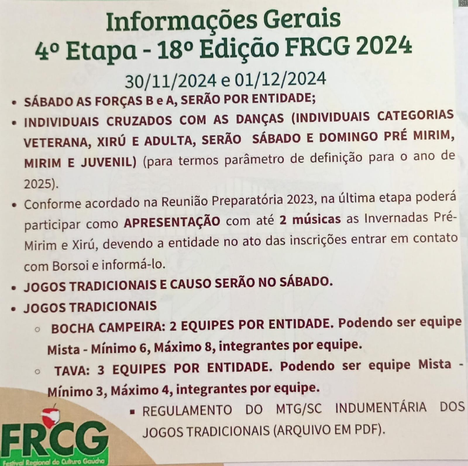 O evento seguirá o regulamento do MTG/SC, com mais detalhes disponíveis no documento oficial sobre indumentária e jogos tradicionais.