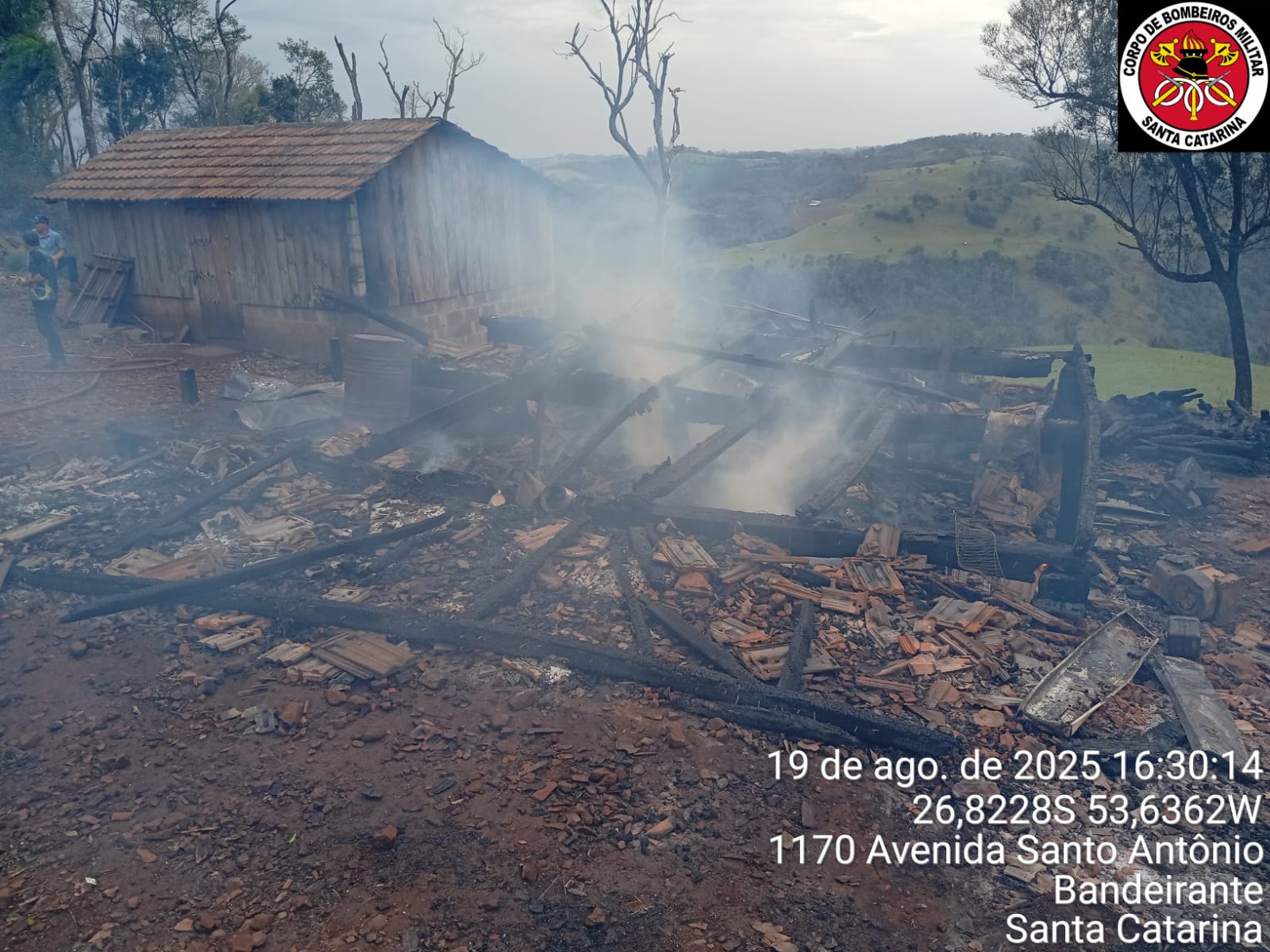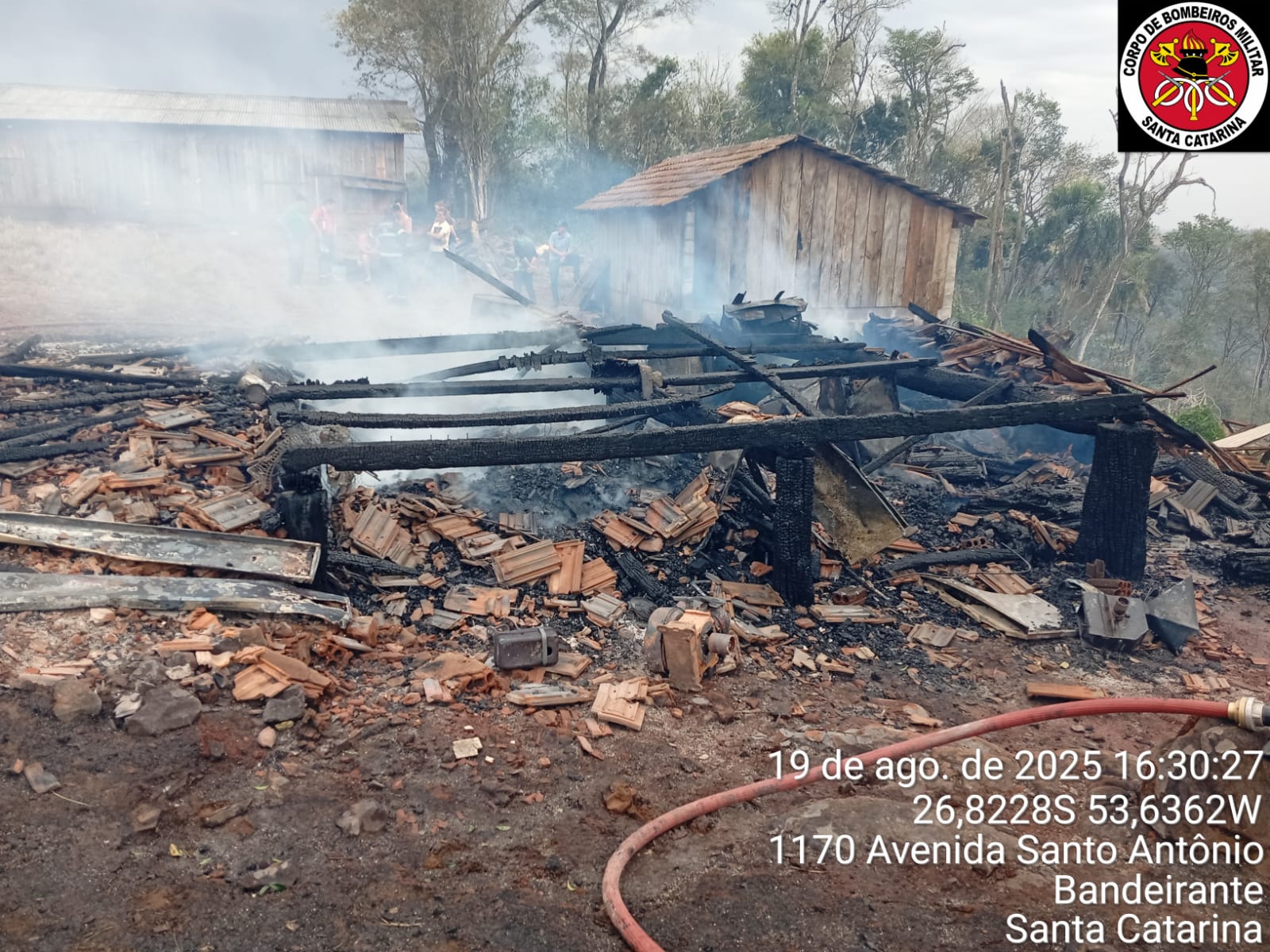 Ao chegar ao local, a guarnição constatou que a edificação de aproximadamente 70 m² já estava completamente tomada pelas chamas. O trabalho concentrou-se na proteção de um galpão vizinho, onde havia animais presos, evitando que o fogo se alastrasse. Foram utilizados cerca de 6 mil litros de água no combate e rescaldo, devido à grande quantidade de madeira armazenada.