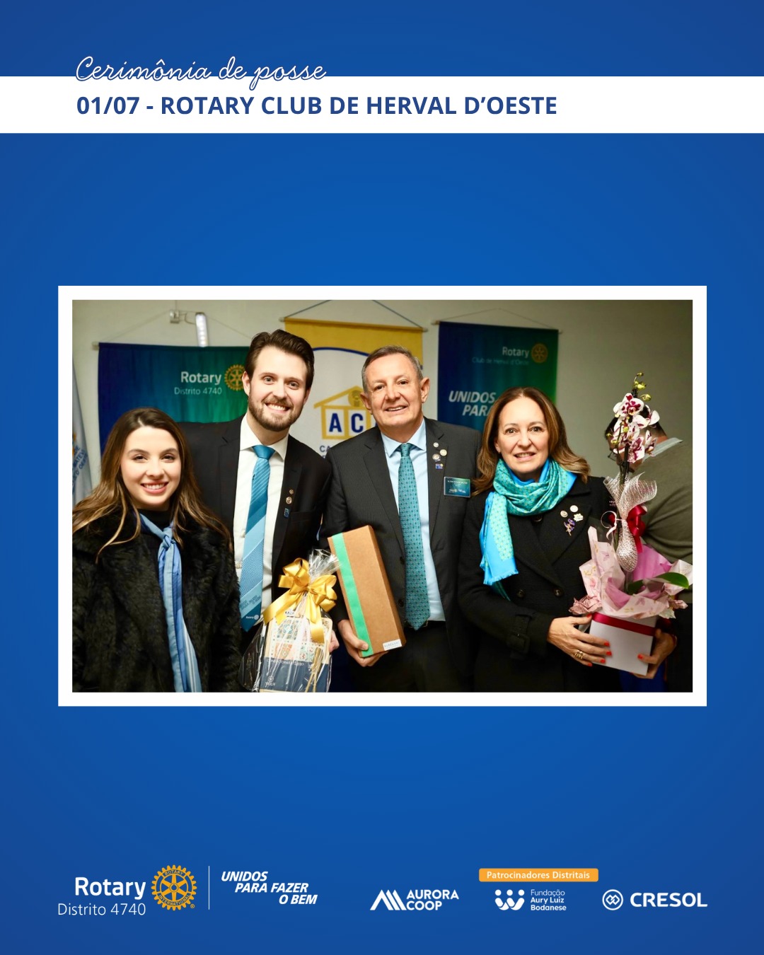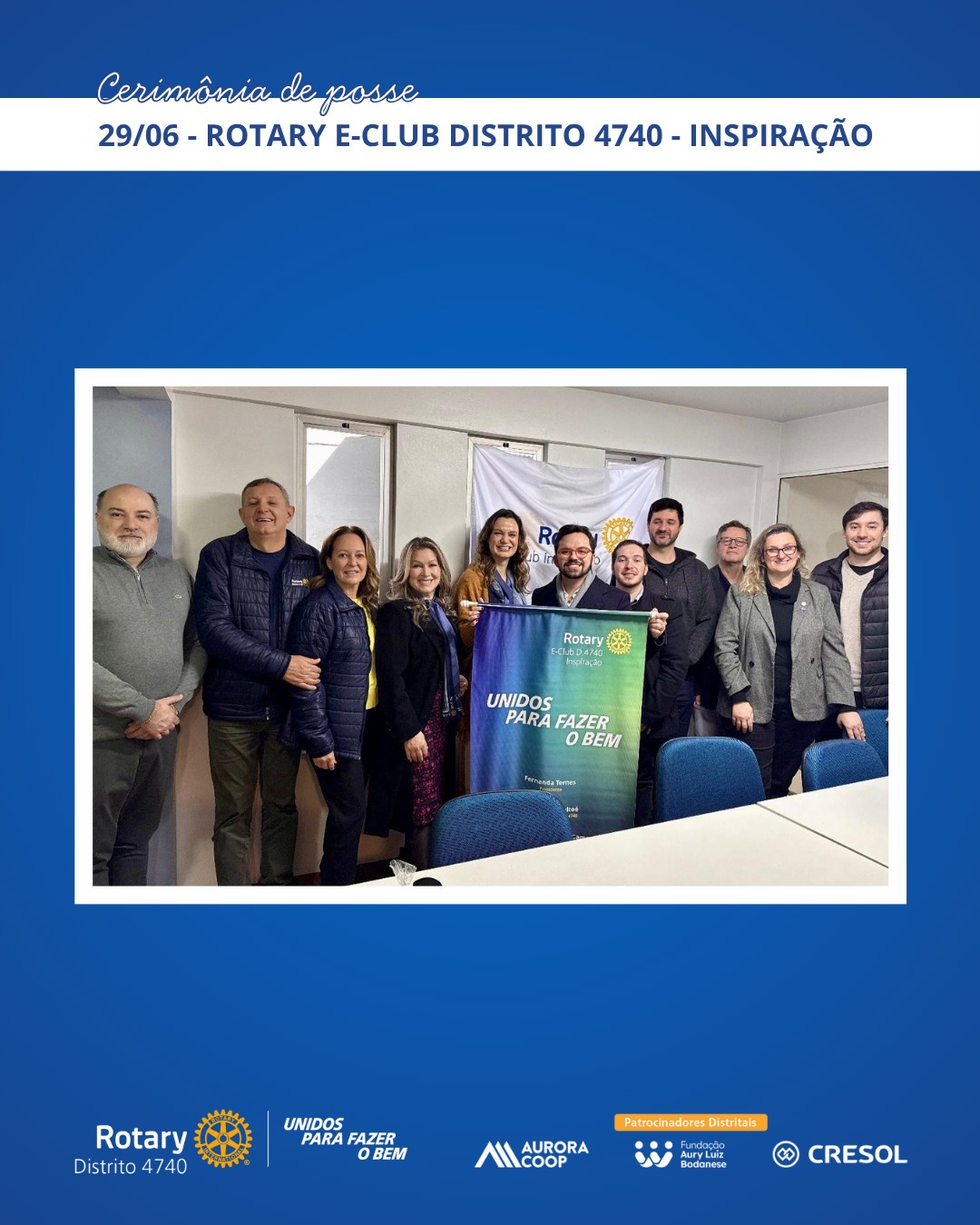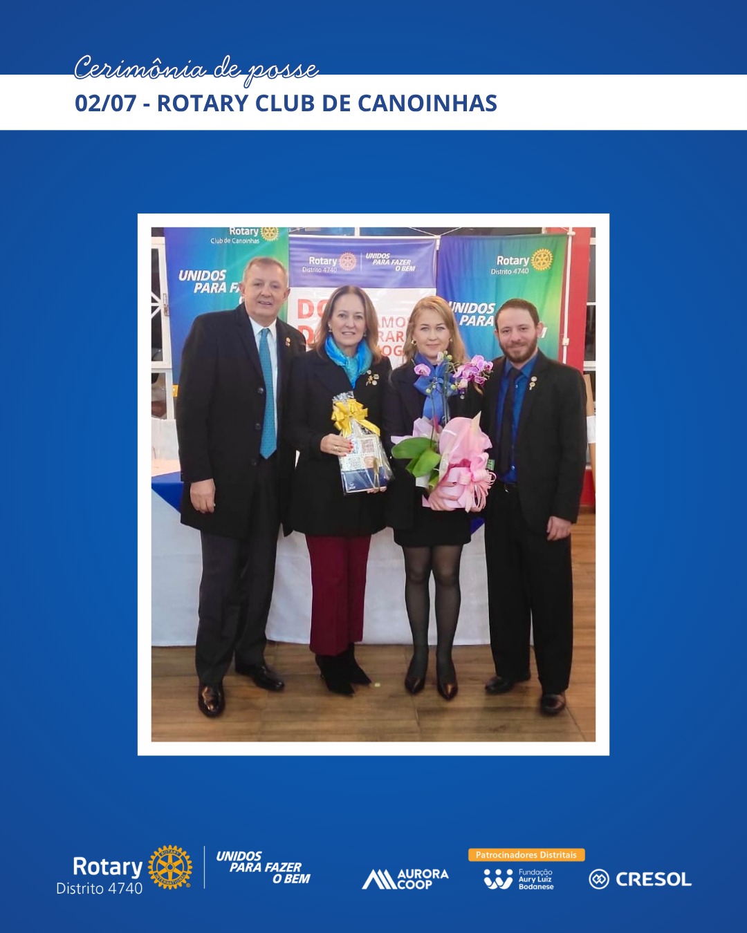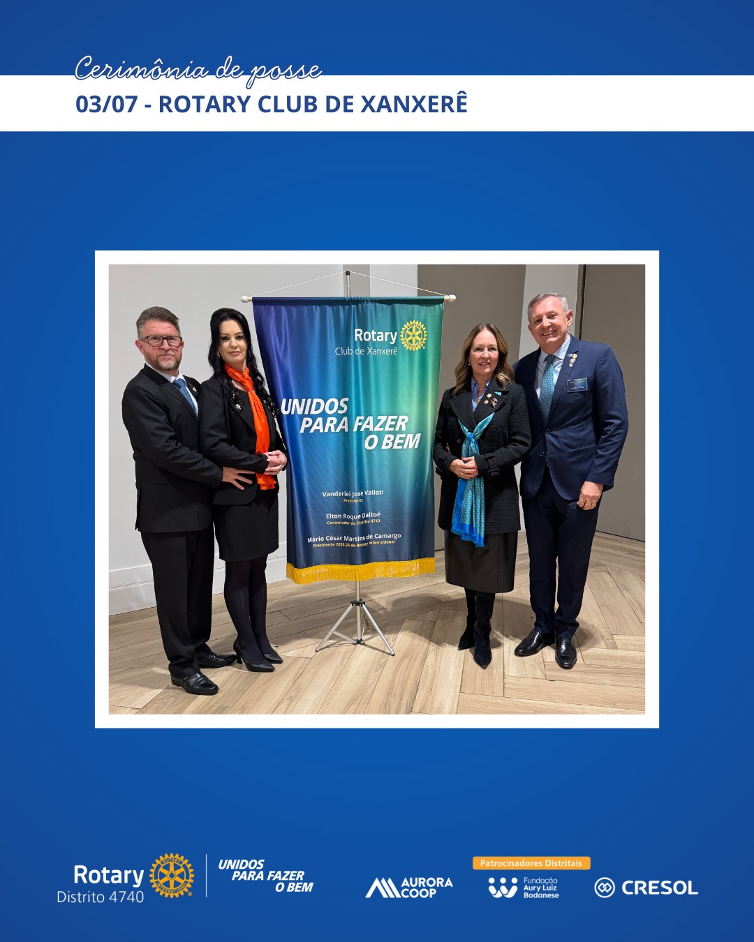 A primeira posse acompanhada pela governadoria ocorreu em 17 de junho, no Rotary Club de São Miguel do Oeste, com a condução do presidente Marcelo Shallenberger. Em 29 de junho, foi a vez da presidente Fernanda Ternes assumir o comando do Rotary E-Club Distrito 4740 – Inspiração. As visitas seguiram por Herval d’Oeste, Canoinhas, Xanxerê, Chapecó e Catanduvas, entre os dias 1º e 9 de julho, com destaque para o acolhimento dos clubes e o reforço do espírito colaborativo entre os rotarianos.