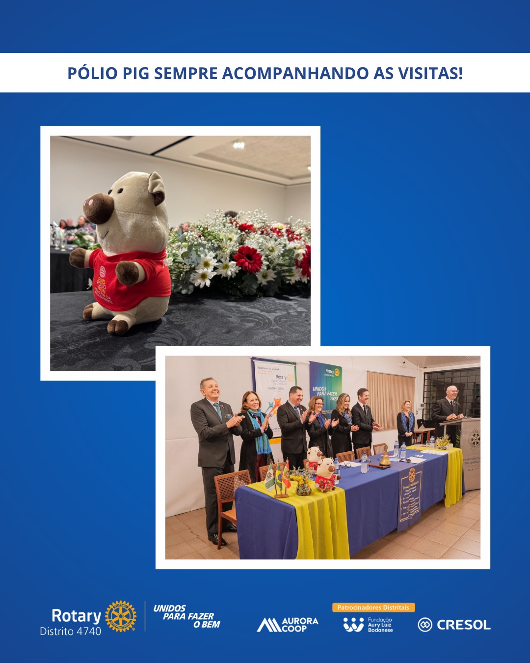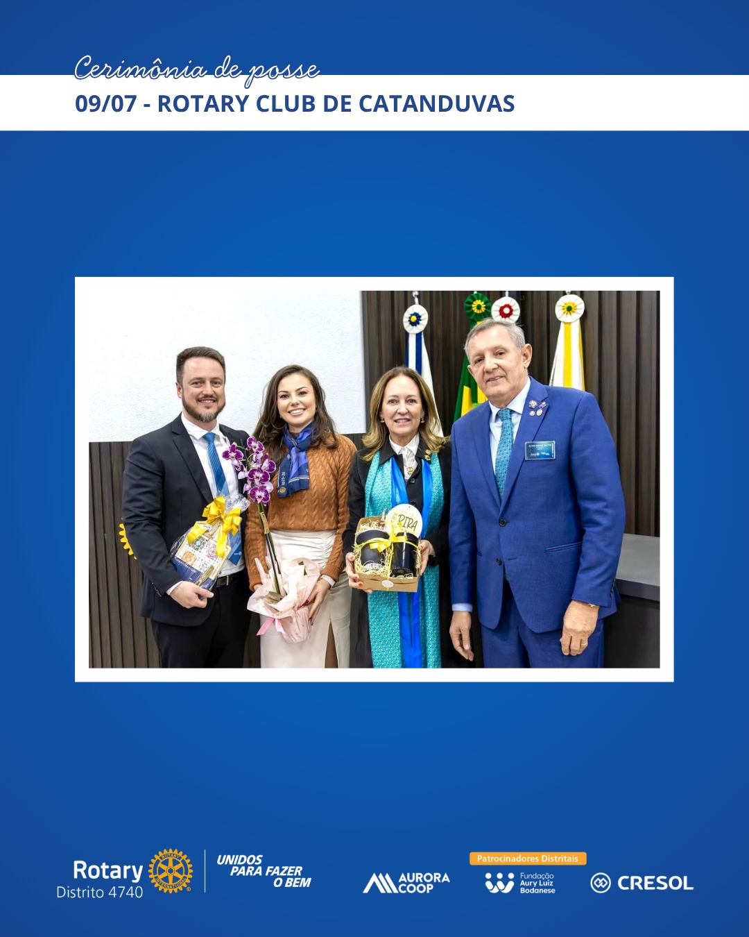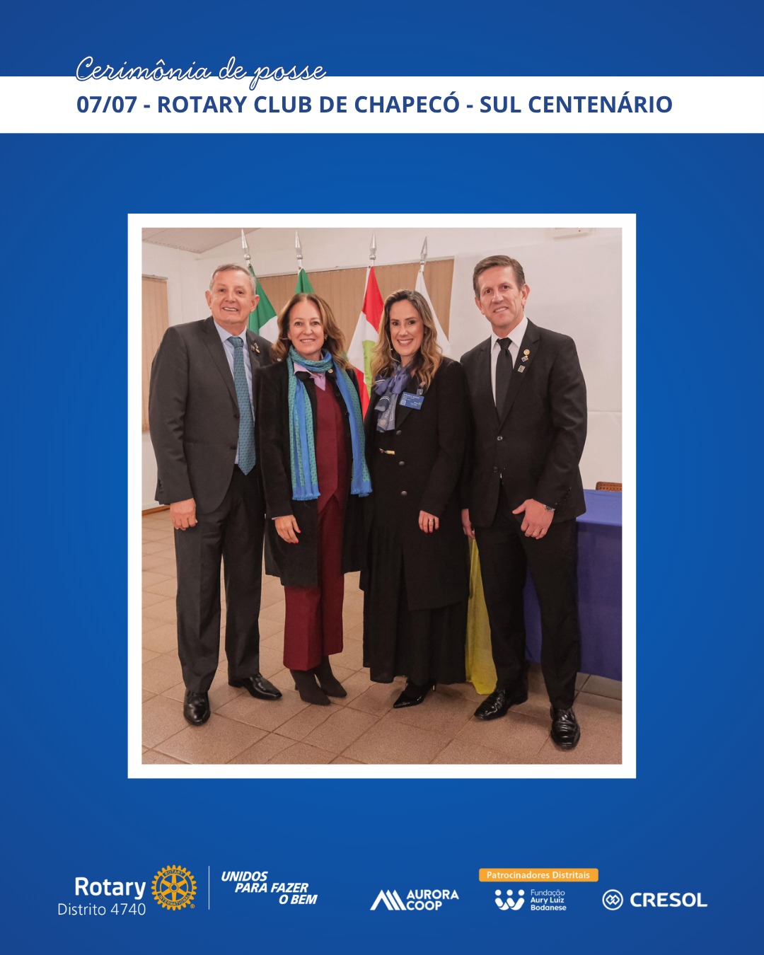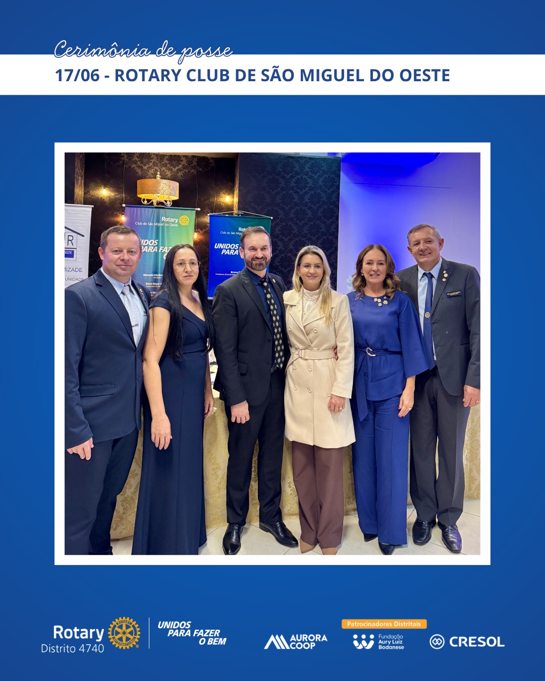 A primeira posse acompanhada pela governadoria ocorreu em 17 de junho, no Rotary Club de São Miguel do Oeste, com a condução do presidente Marcelo Shallenberger. Em 29 de junho, foi a vez da presidente Fernanda Ternes assumir o comando do Rotary E-Club Distrito 4740 – Inspiração. As visitas seguiram por Herval d’Oeste, Canoinhas, Xanxerê, Chapecó e Catanduvas, entre os dias 1º e 9 de julho, com destaque para o acolhimento dos clubes e o reforço do espírito colaborativo entre os rotarianos.