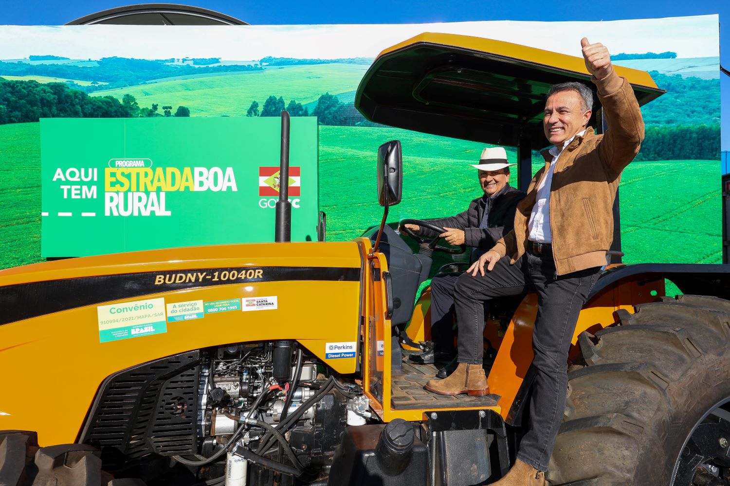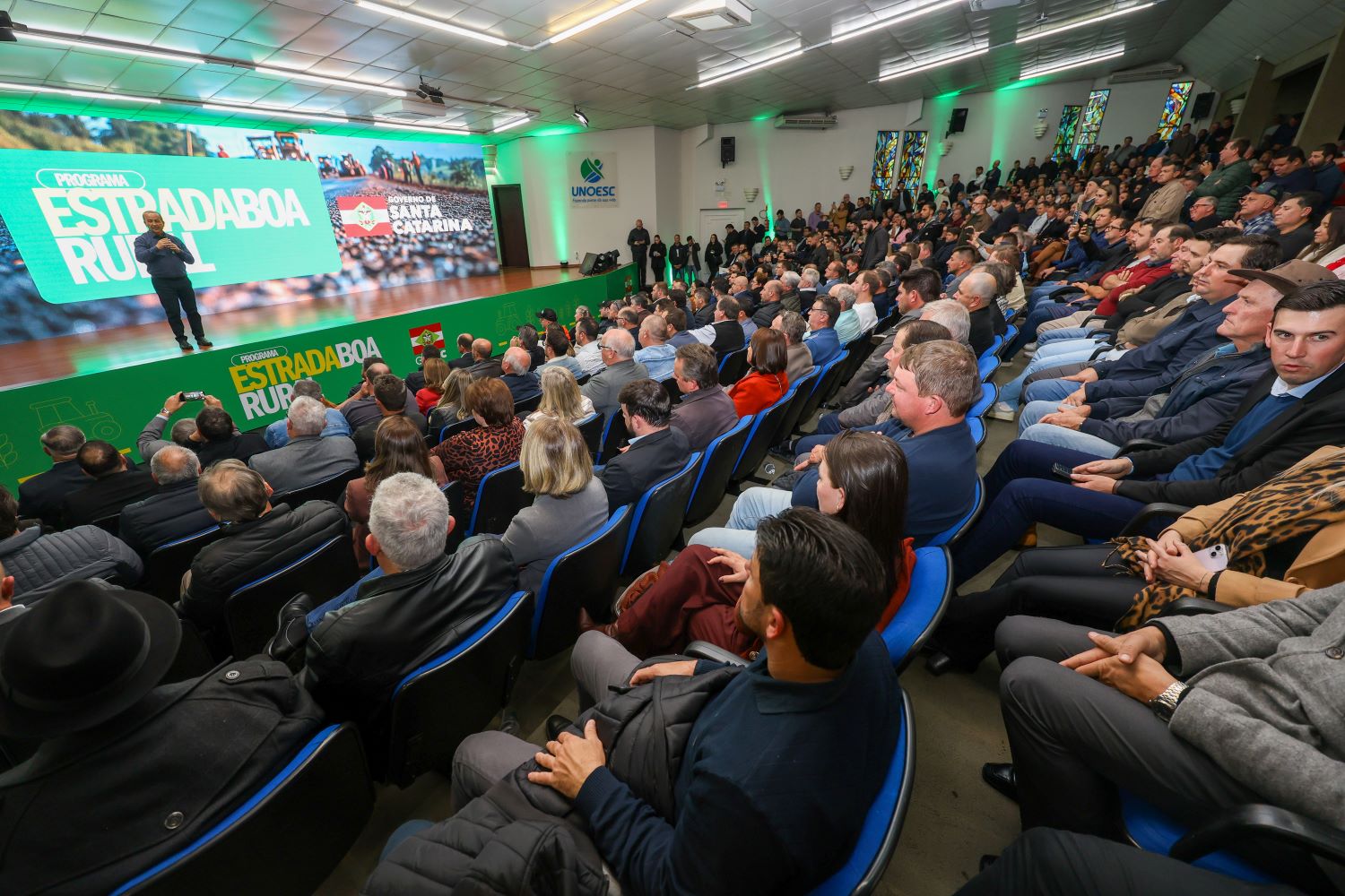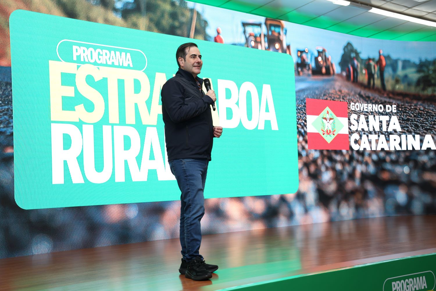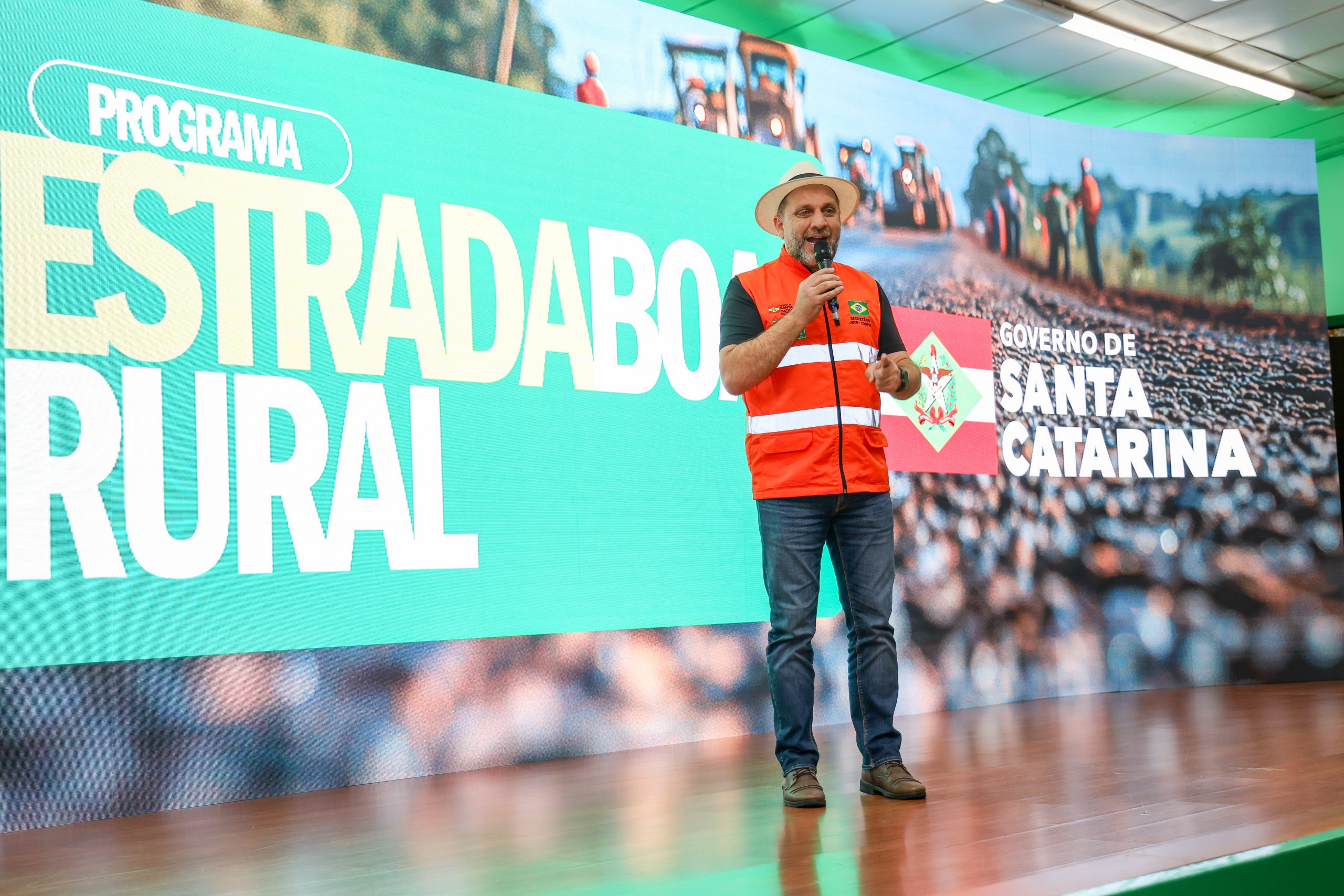Última atualização: 2025/07/04 10:42:07O governador Jorginho Mello lançou, nesta quinta-feira (3), em Joaçaba, no Meio-Oeste catarinense, o programa Estrada Boa Rural, uma ação inédita que promete transformar a malha viária do interior de Santa Catarina. Com investimento recorde de R$ 2,5 bilhões, o programa vai pavimentar 2.500 quilômetros de estradas rurais em todos os 295 municípios do estado. O lançamento reuniu 202 prefeitos e 114 vice-prefeitos, simbolizando o amplo apoio municipal à iniciativa, que visa fortalecer o agronegócio, facilitar o escoamento da produção e garantir mais qualidade de vida à população do campo.