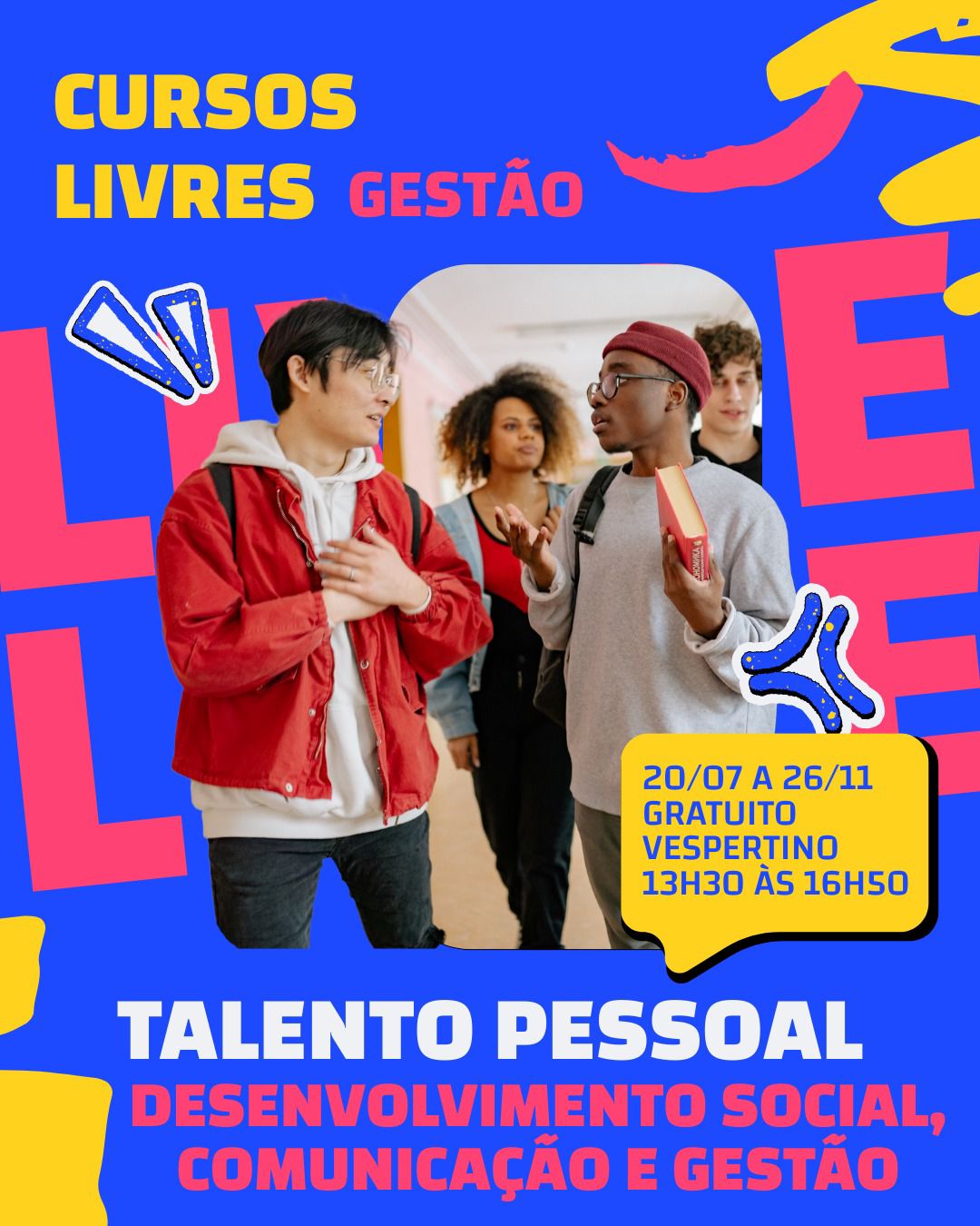 Uma das opções é o curso Talento Pessoal: desenvolvimento social, comunicação e gestão, destinado a adolescentes de 13 a 17 anos. As aulas serão realizadas de segunda a quarta-feira, no período vespertino, com início no dia 20 de julho e término em 26 de novembro de 2026, totalizando 222 horas de formação.