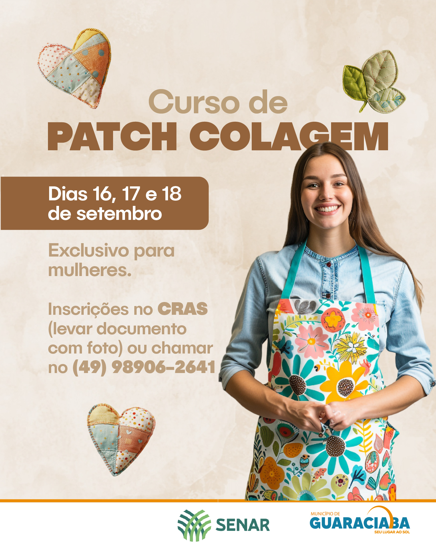 O município de Guaraciaba promoverá entre os dias 16 e 18 de setembro um curso gratuito de Patch Colagem, destinado exclusivamente a mulheres.