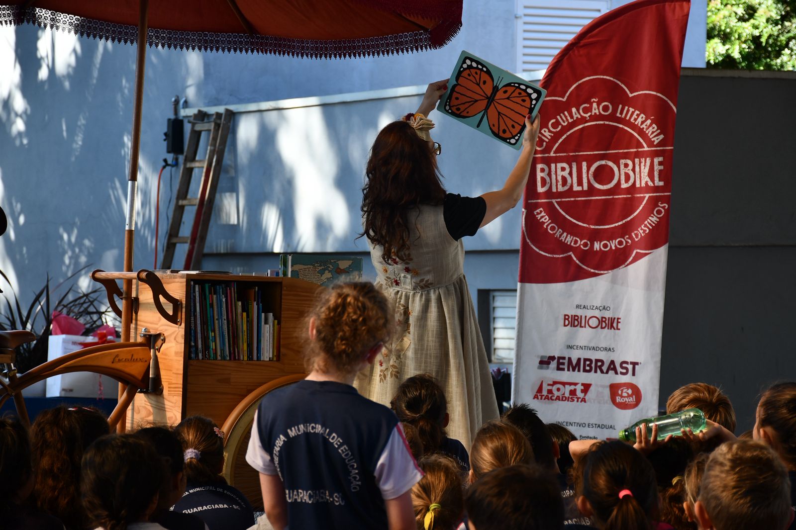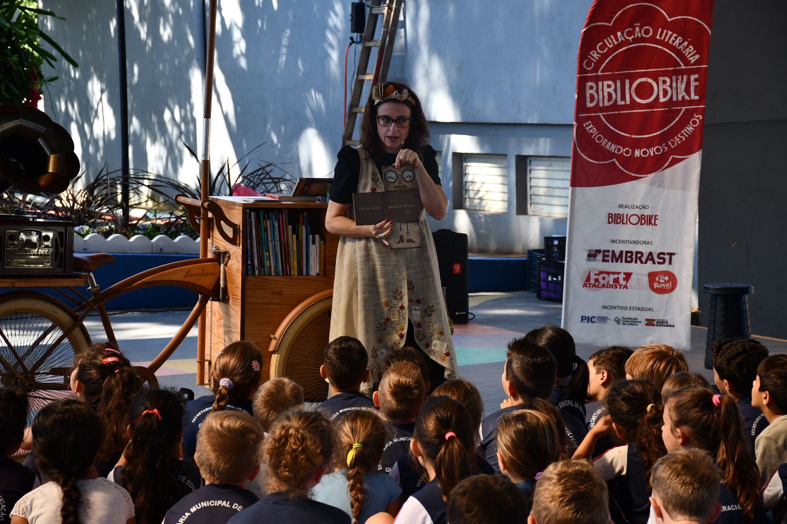 A iniciativa é conduzida por Camila Miotto, mediadora de leitura de Chapecó, que trouxe ao município uma proposta dinâmica e envolvente: uma bicicleta especialmente adaptada que carrega mais de 300 títulos literários e convida o público a mergulhar em histórias cheias de imaginação. Logo no início, Camila conduz os estudantes a uma roda de contação de histórias, embalando todos com música, poesia e narrativas escolhidas para emocionar e inspirar.